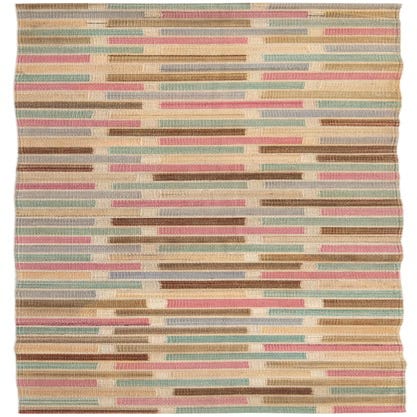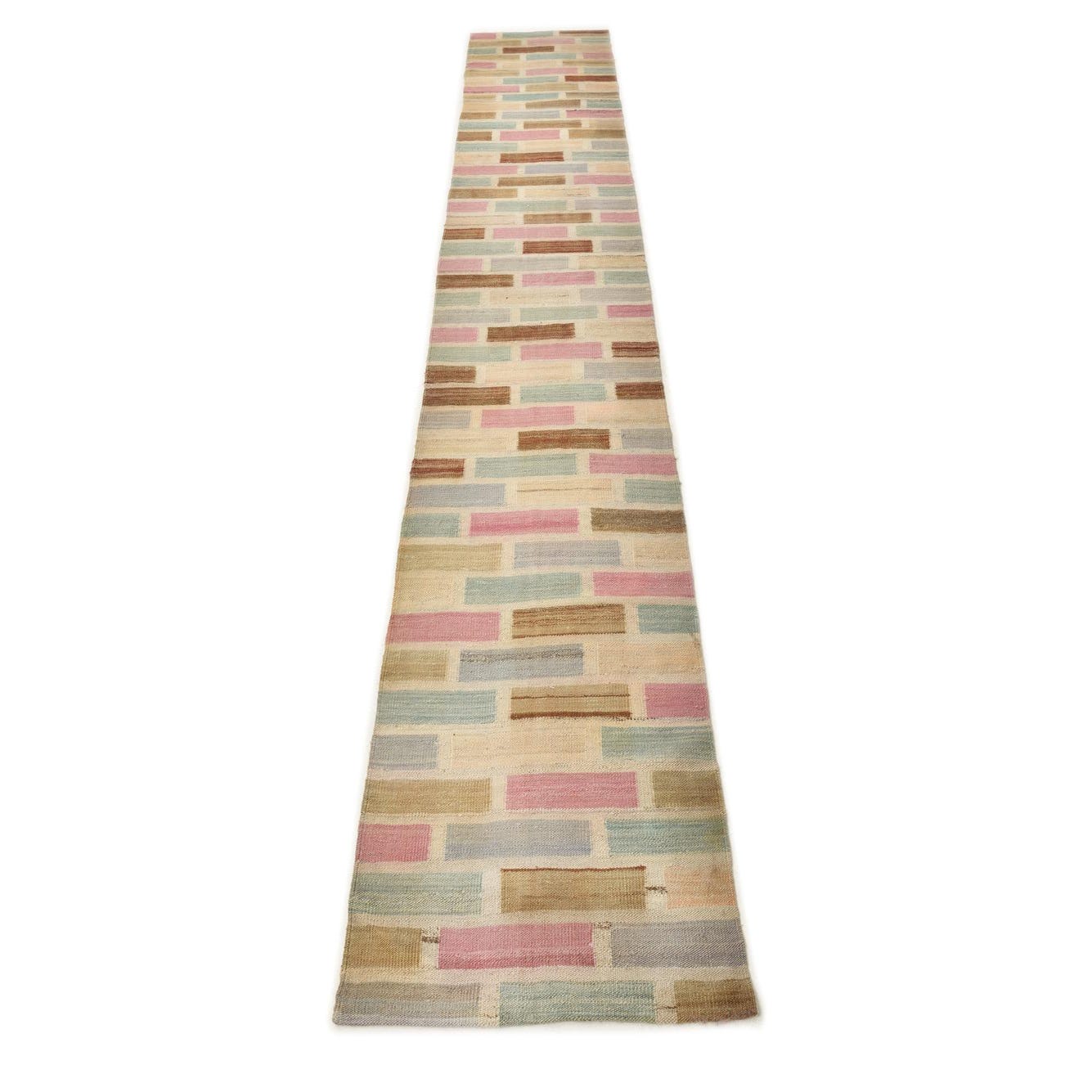 A 12 ft runner rug featuring a modern abstract pattern of horizontal blocks in pink, blue, brown, and beige.
