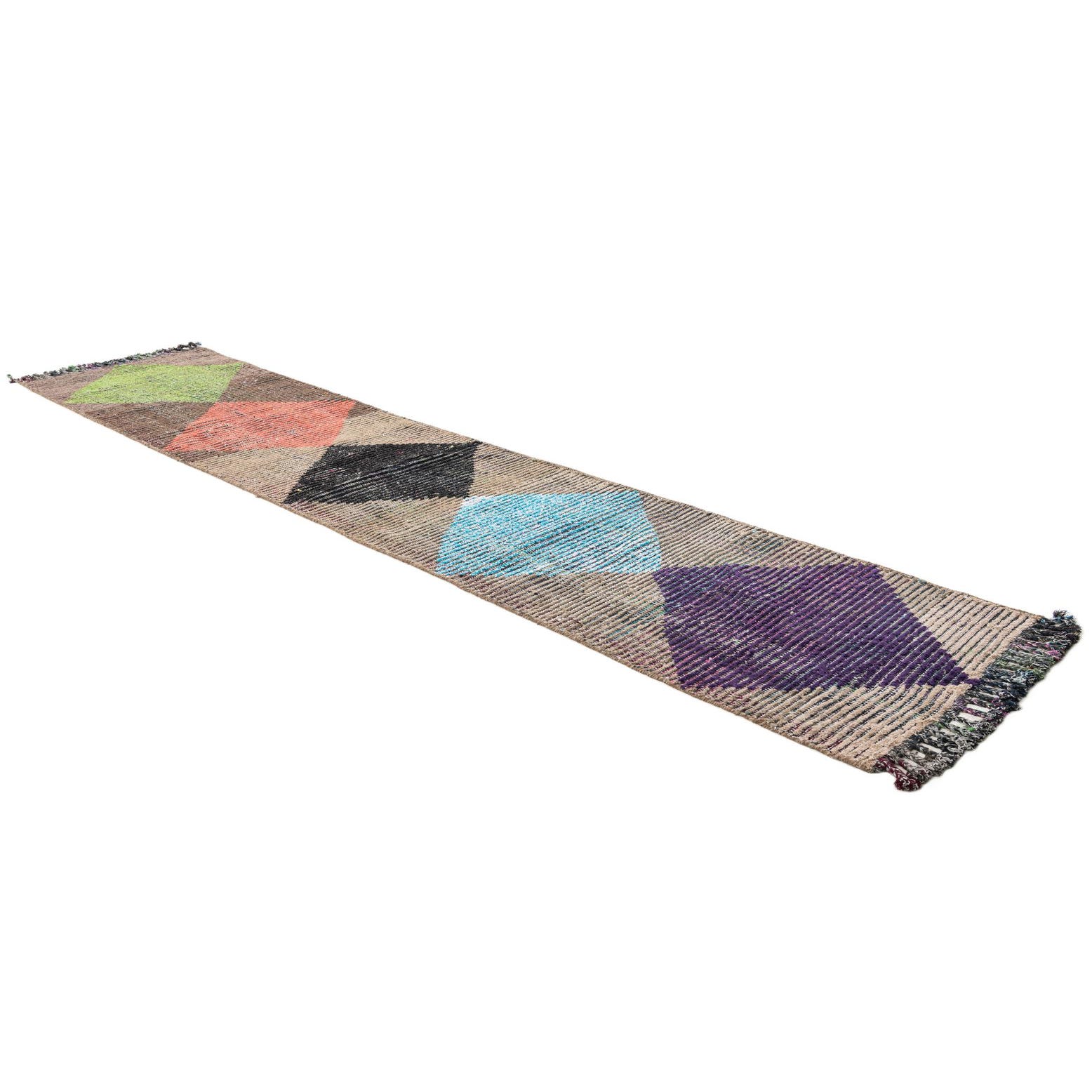 A 12 ft multi-colored wool runner rug featuring large, vibrant diamond patterns in green, coral, black, blue, and purple on a textured brown background, perfect for a hallway.