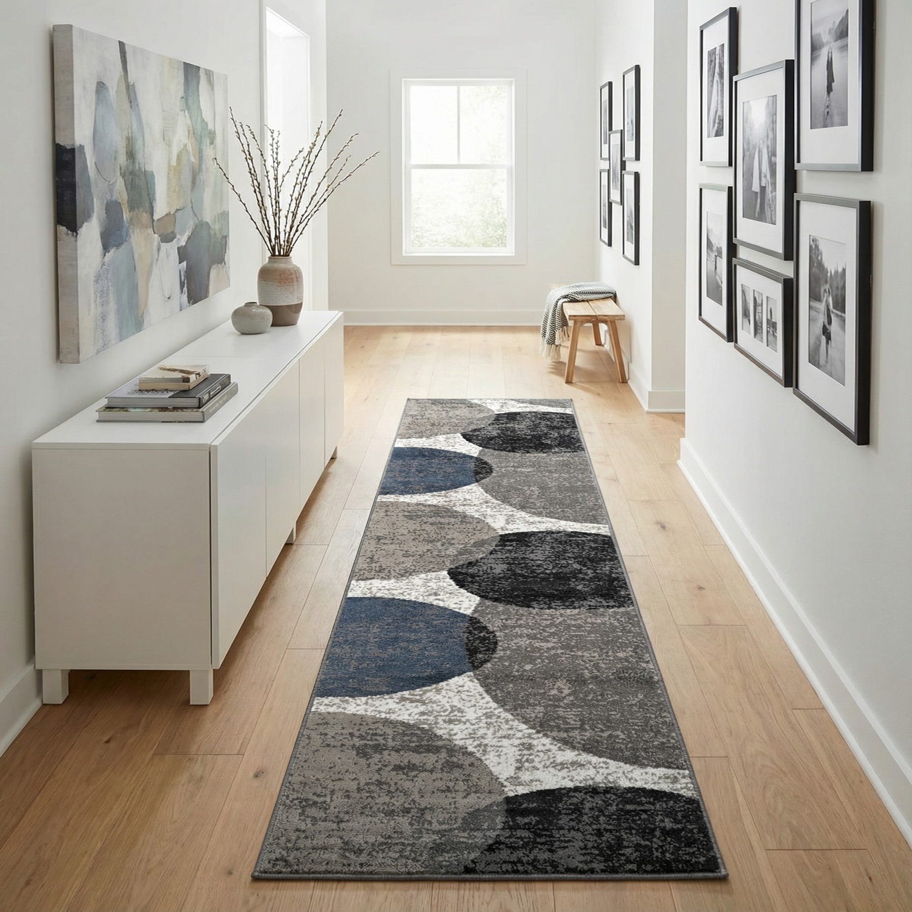 A 12 ft runner rug with a modern abstract pattern in shades of grey, black, blue, and white, perfect for a hallway.