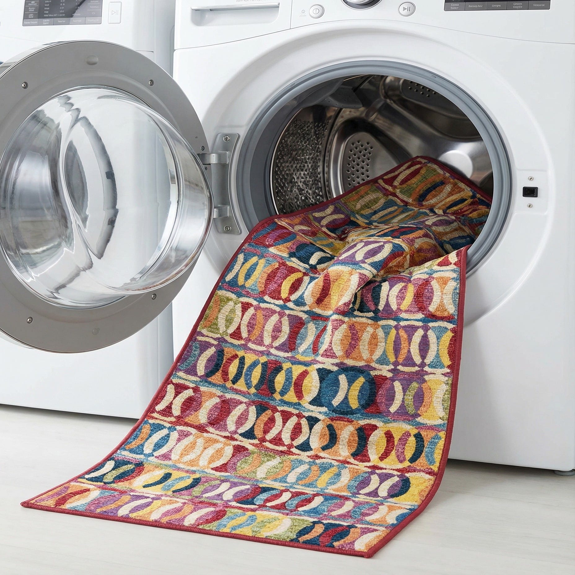 A vibrant 12 ft runner rug with a modern abstract pattern of interlocking multi-colored ovals, ideal for a hallway or patio.