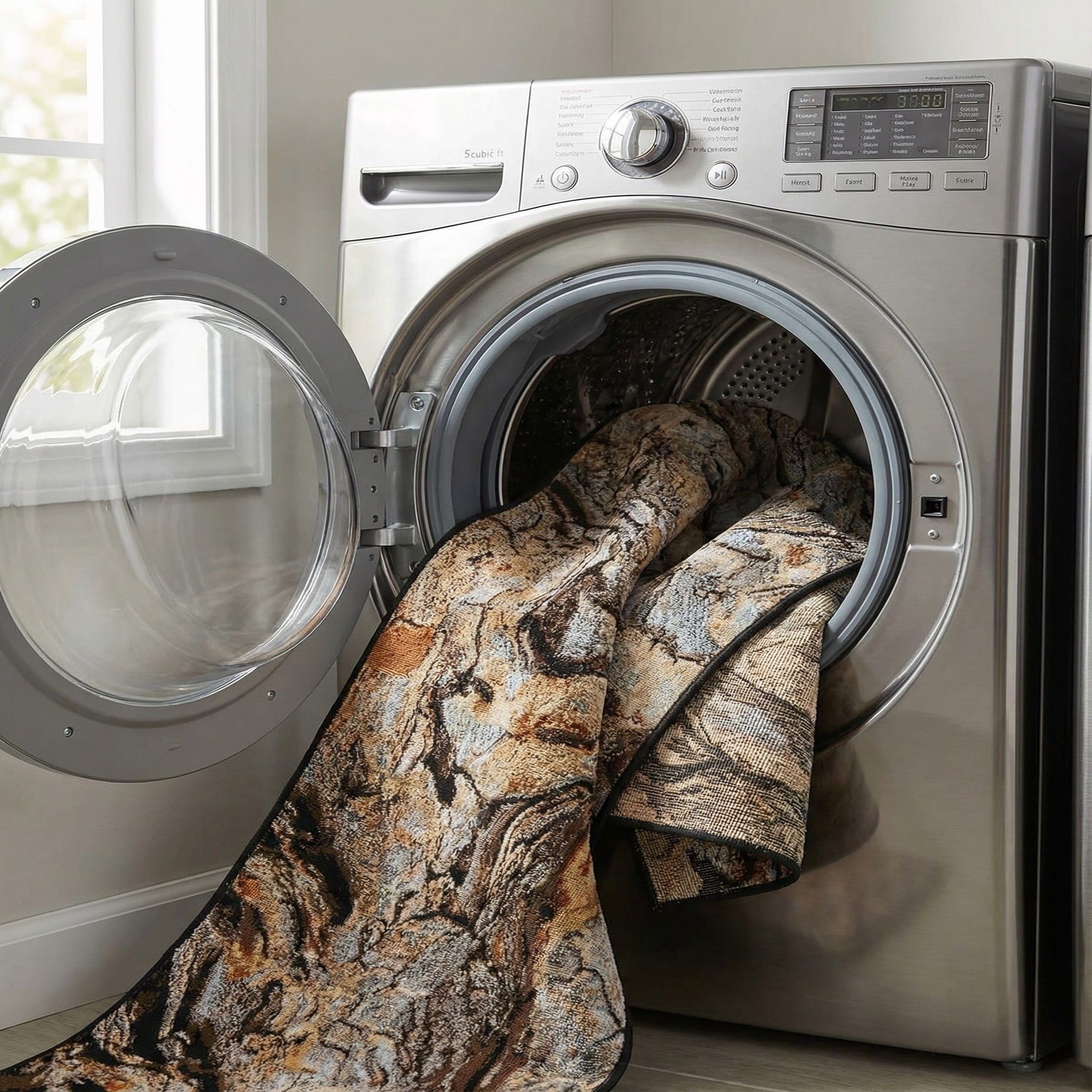 A 12 ft runner rug with an abstract, multi-colored pattern resembling natural rock or wood grain, ideal for a patio or hallway.