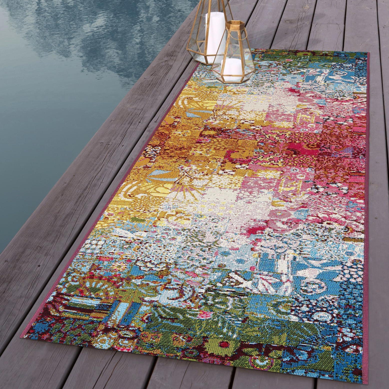 A 12 ft multi-colored modern runner rug with a vibrant patchwork design, ideal for a hallway or patio.