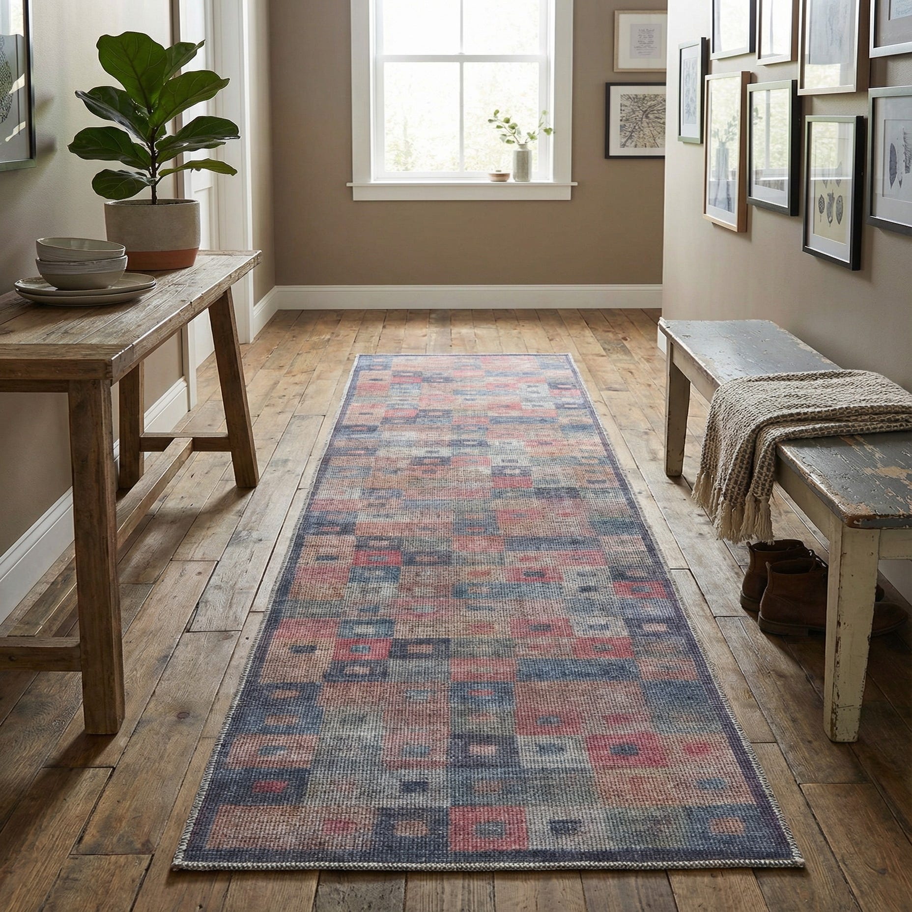 A modern patchwork of small squares and rectangles arranged in an irregular grid, this runner pairs a washed, painterly finish with subtle nested motifs for a lived-in, vintage-inspired look. The multi-tonal background supports layers of beige, brown, gray, green, navy blue, red, light blue, light brown and peach that blend together for soft color variation across the surface. The pattern reads as geometric but relaxed, with muted contrasts that add visual interest without dominating a room.