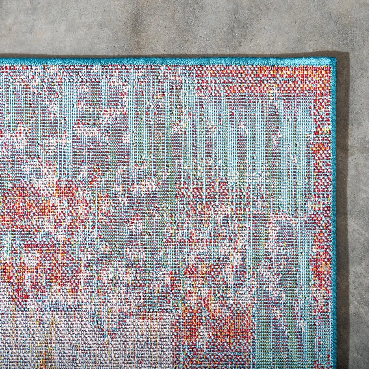 A machine-made runner woven from 100% polypropylene, this piece presents a vintage-inspired, distressed medallion pattern layered over a multi background. Blues and navy anchor the design while gray and ivory provide neutral contrast, and red and orange accents punctuate the surface for warmth and visual interest. The pattern combines traditional motifs with painterly, worn areas that give the rug an intentionally aged look without heavy pile.