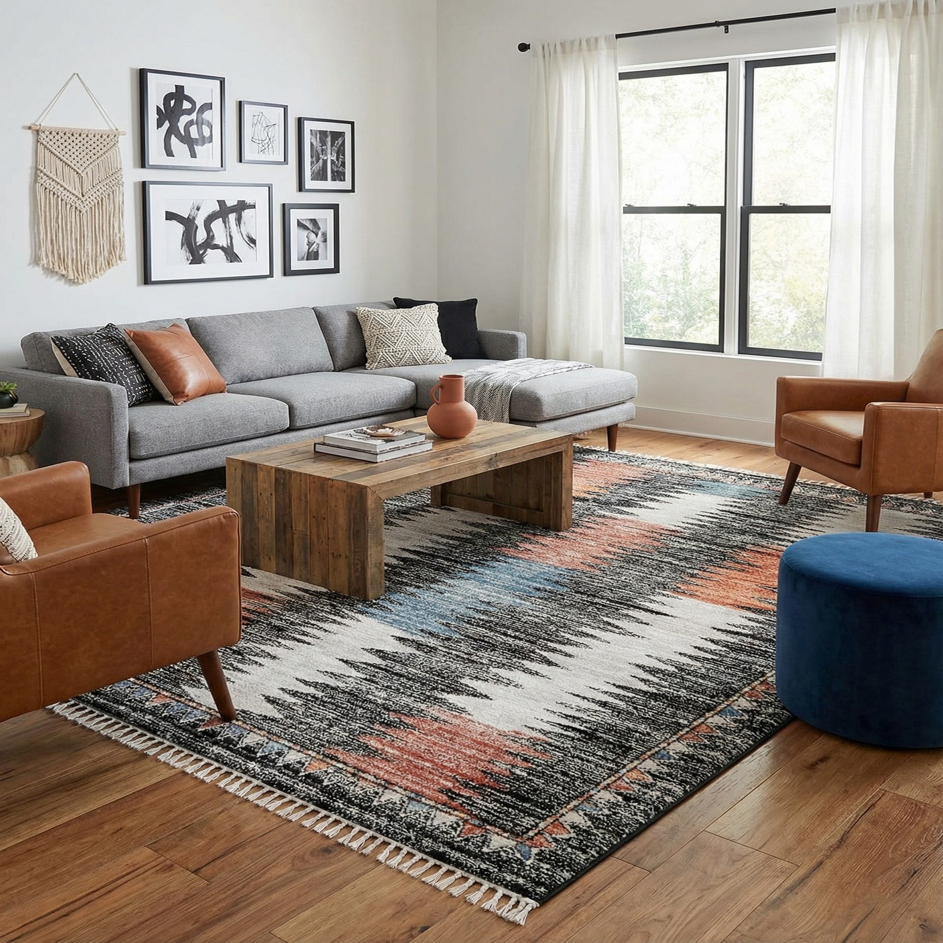 This rug pairs nicely with warm wood tones and leather seating for a cozy living room grounding, or with lighter mid-century pieces where the light blue accents can echo ceramic or glass accessories. It also complements layered, modern-boho interiors—think woven throws, potted plants and mixed metals—and works well under dining tables or in open-plan spaces where a bold pattern can define a seating area without added pile.