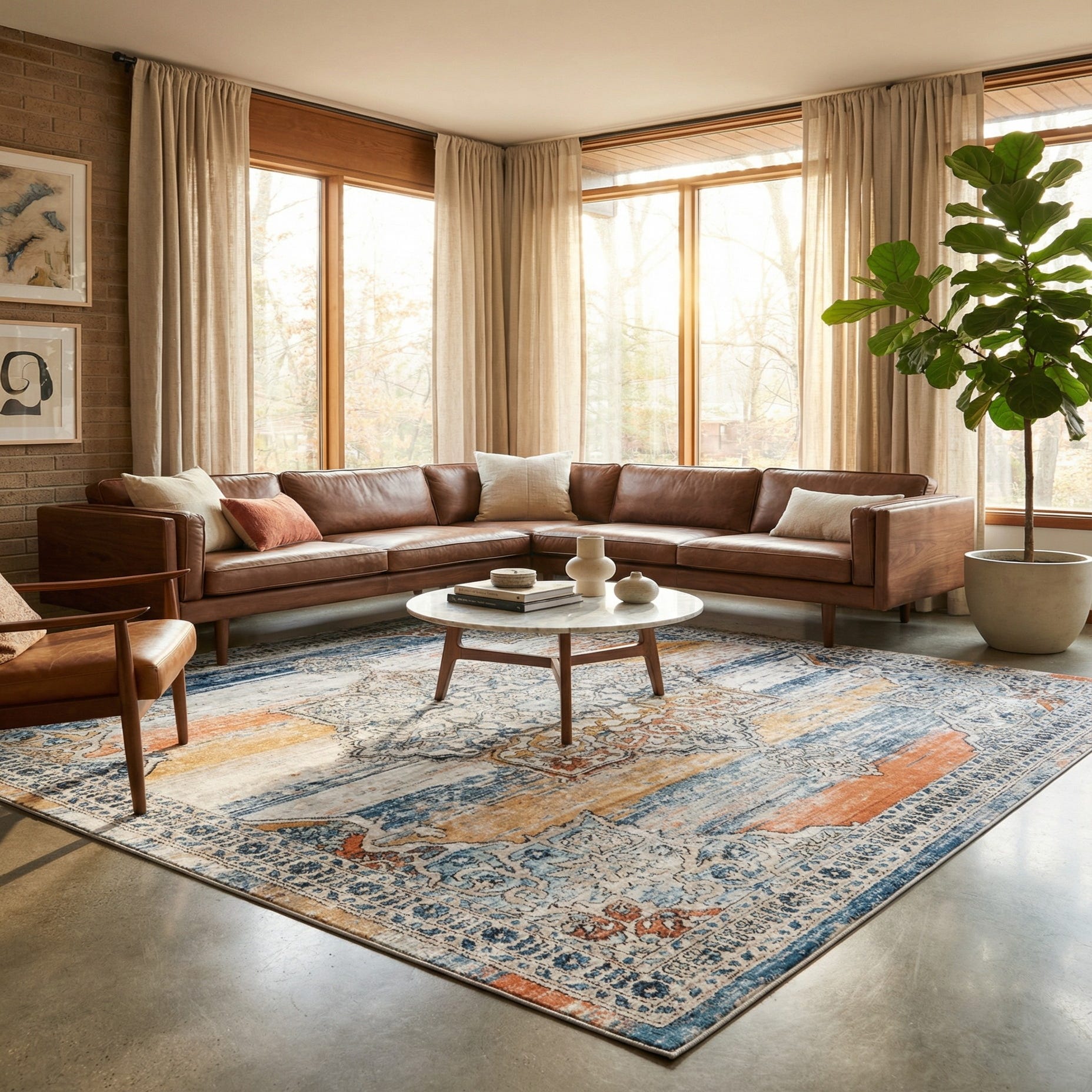 The blend of colors and detailed pattern enhances its versatility, making it an ideal choice for a variety of interior design styles, from eclectic to transitional. The warm rust red and ivory tones can complement wooden or rustic furniture, while the cooler blue and gray shades harmonize with a more contemporary or minimalist decor. Due to its stain-resistant and shed-free properties, this rug is particularly well-suited for dining rooms, living areas, and other spaces where practicality and style are of equal importance.