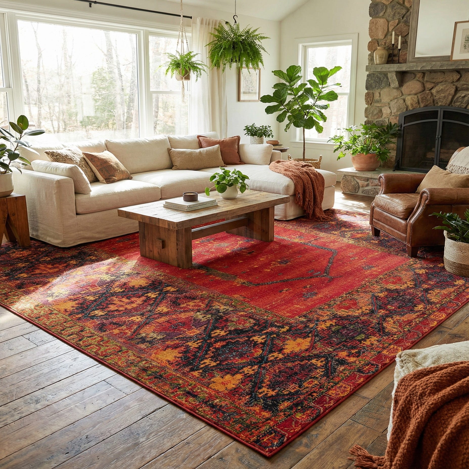 Machine-made polypropylene gives the surface a low-profile pile with a firm, slightly dense hand that feels smooth underfoot and holds its pattern definition outdoors or inside. Use it on a covered patio for an al fresco seating area, under a rustic dining table to anchor a mixed-material scheme, or in a sunroom paired with leather seating, woven accents and plants to emphasize its warm, global character. The rug’s palette coordinates easily with deep navy or olive upholstery and natural wood finishes for a layered, collected feel.