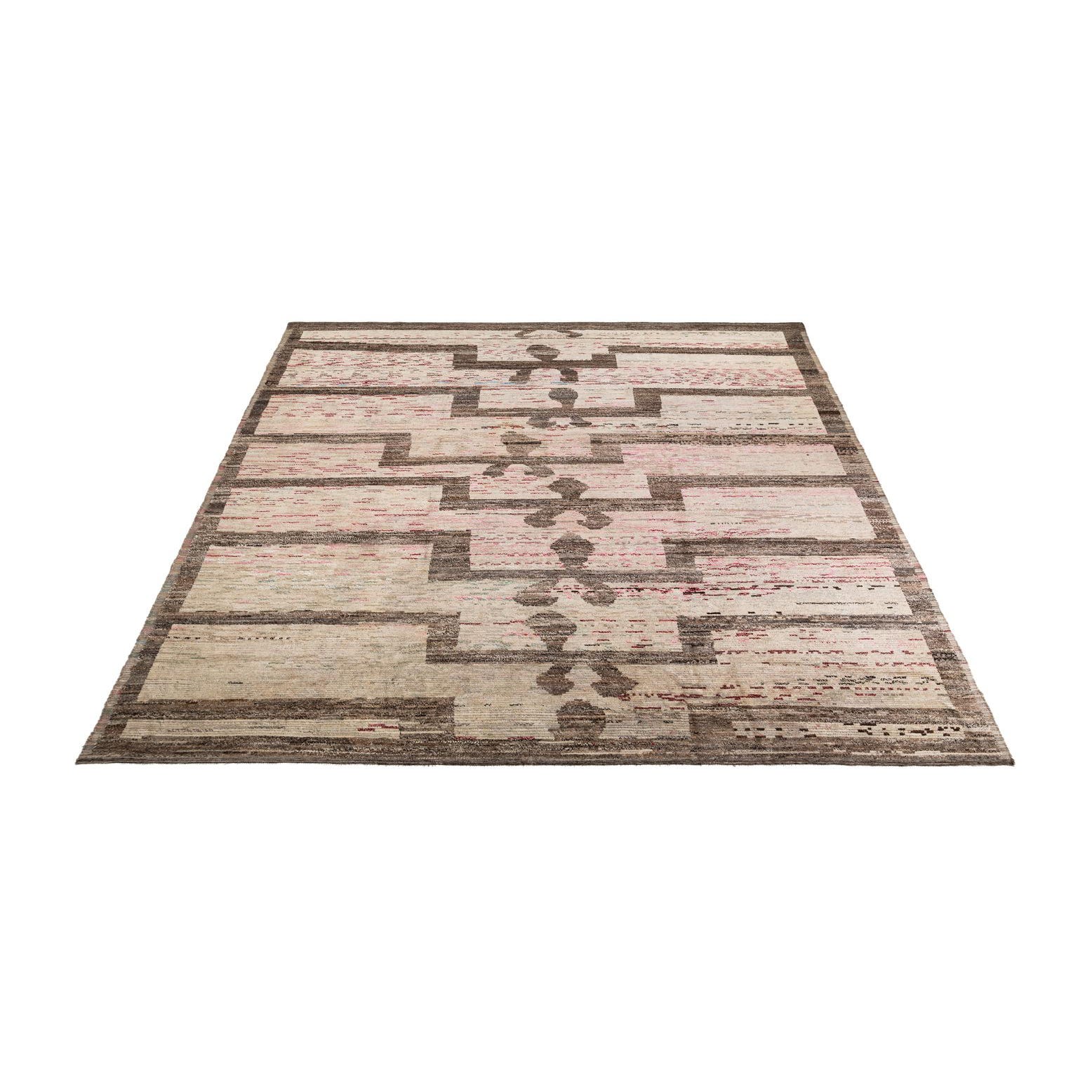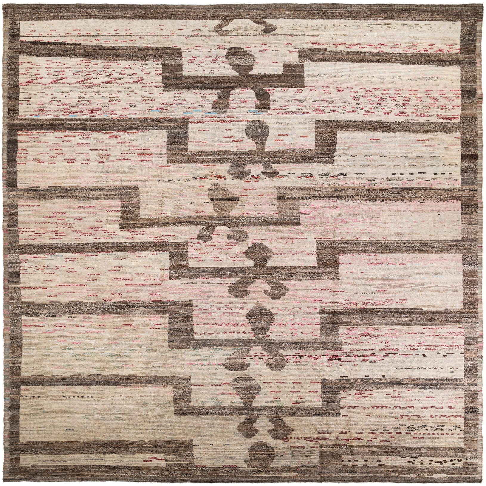 A large 12x15 rectangular multi-colored tribal shag rug with abstract brown geometric patterns and flecks of pink and blue.