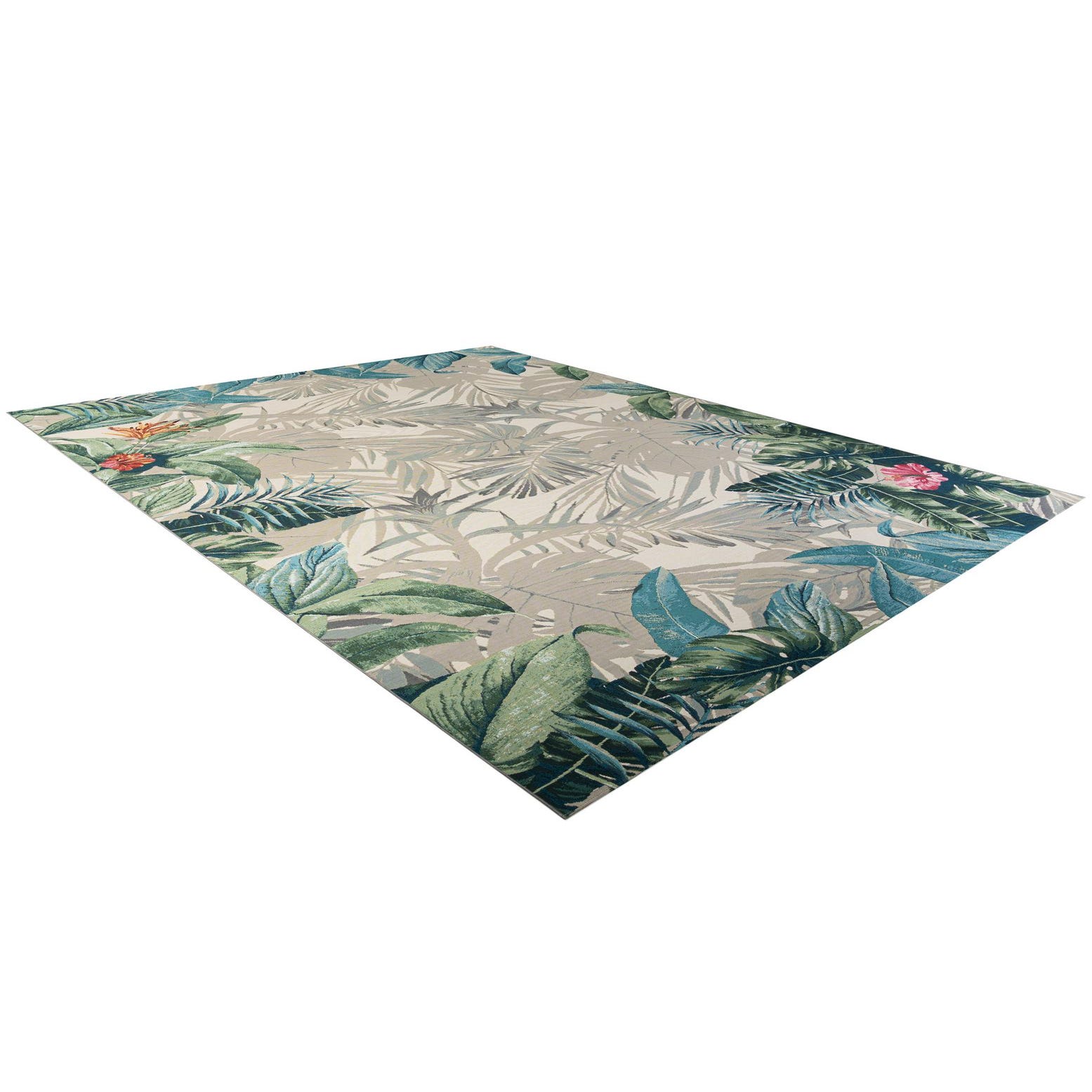 A large 12x16 rectangular multi-colored botanical rug with vibrant green and blue leaves and subtle orange and pink flowers on a light background, suitable for indoor/outdoor use.