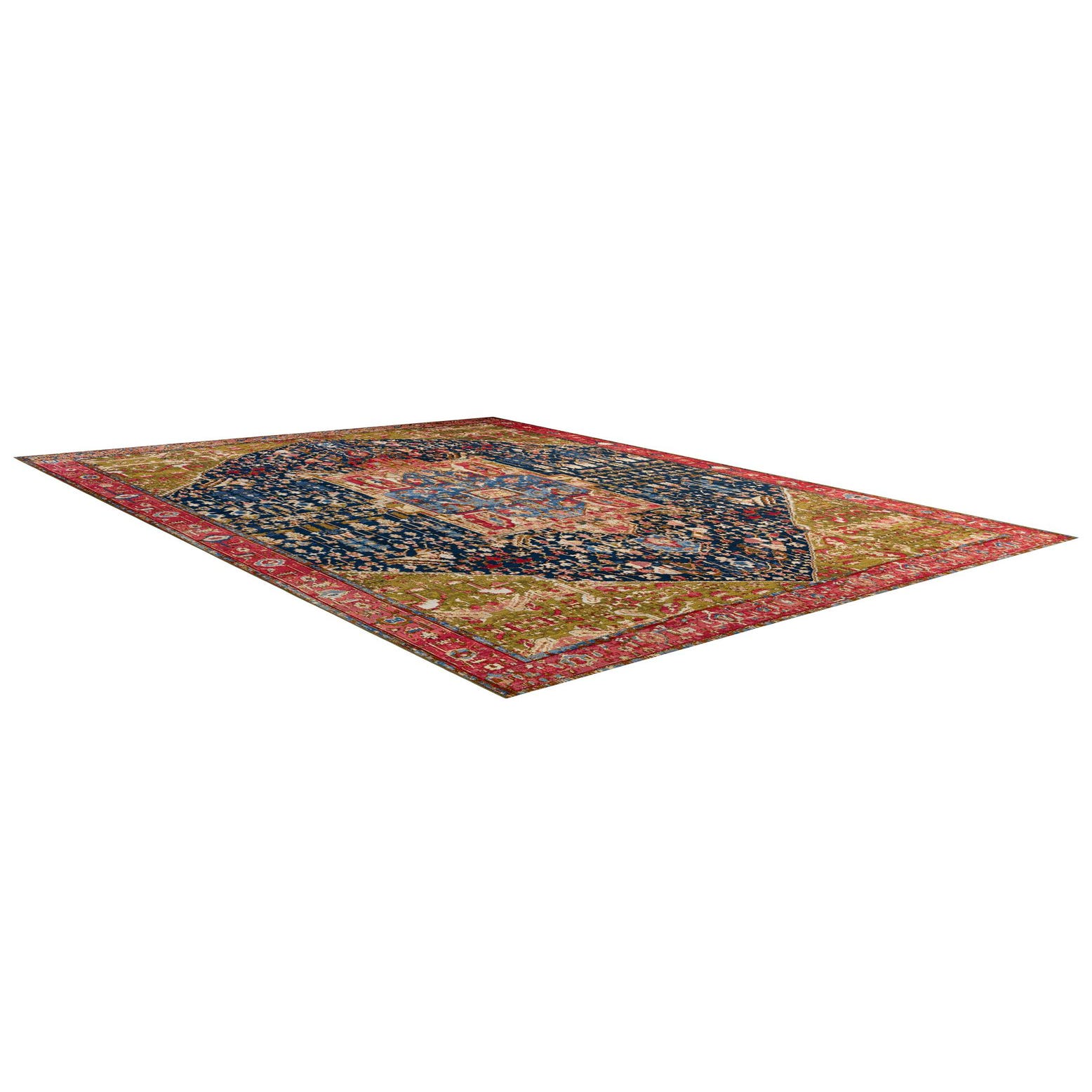 A 12x16 multi-colored rectangular indoor/outdoor rug with a traditional medallion pattern in blue, red, and olive green.