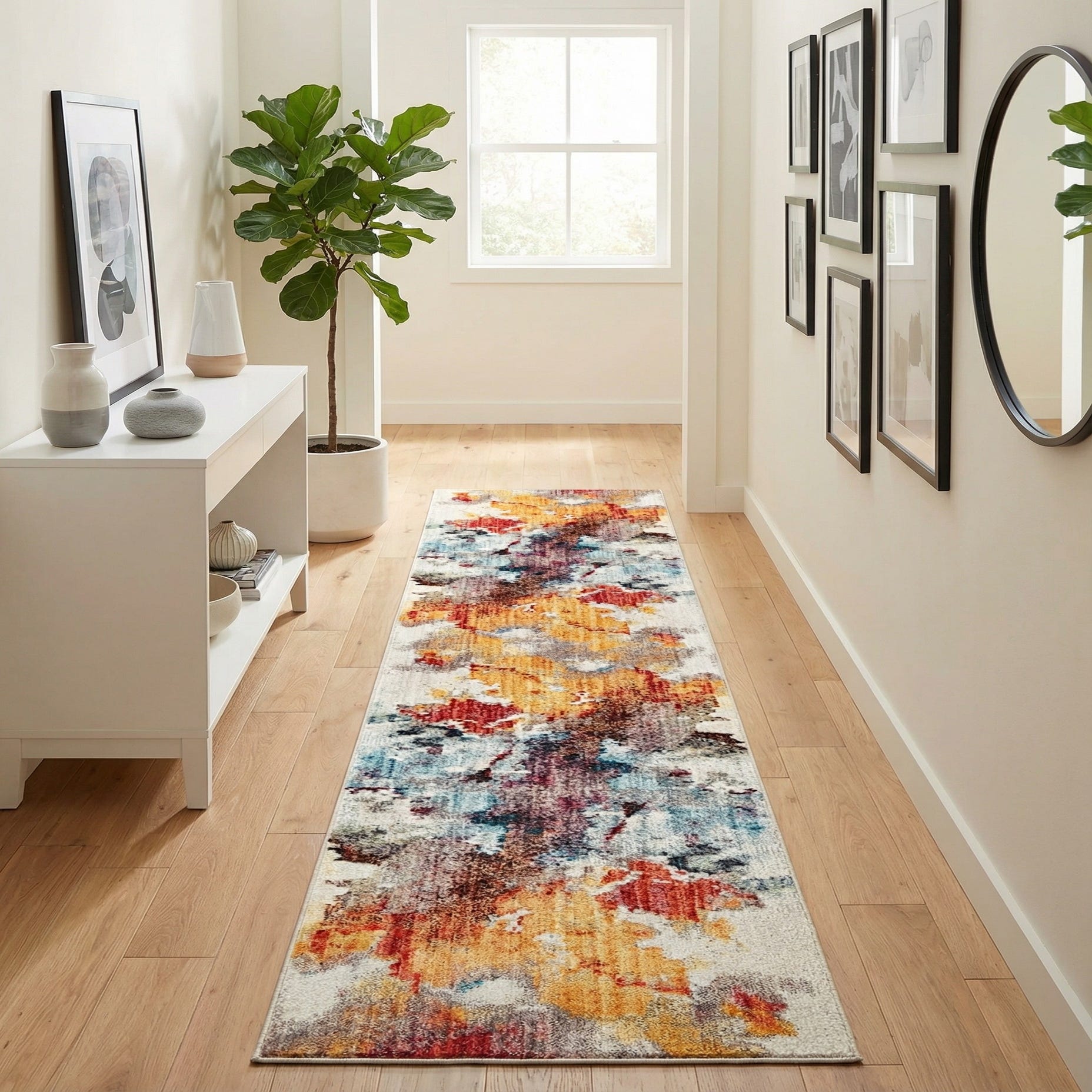 A 13 ft runner rug with a modern abstract pattern in vibrant multi-colors including orange, red, blue, and gray on a light background, suitable for a hallway.