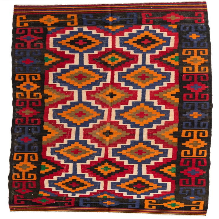 Primary color is Multi. Colors in this rug include: Multi, Beige, Black, Brown, Ivory, Orange, Red, Blue.