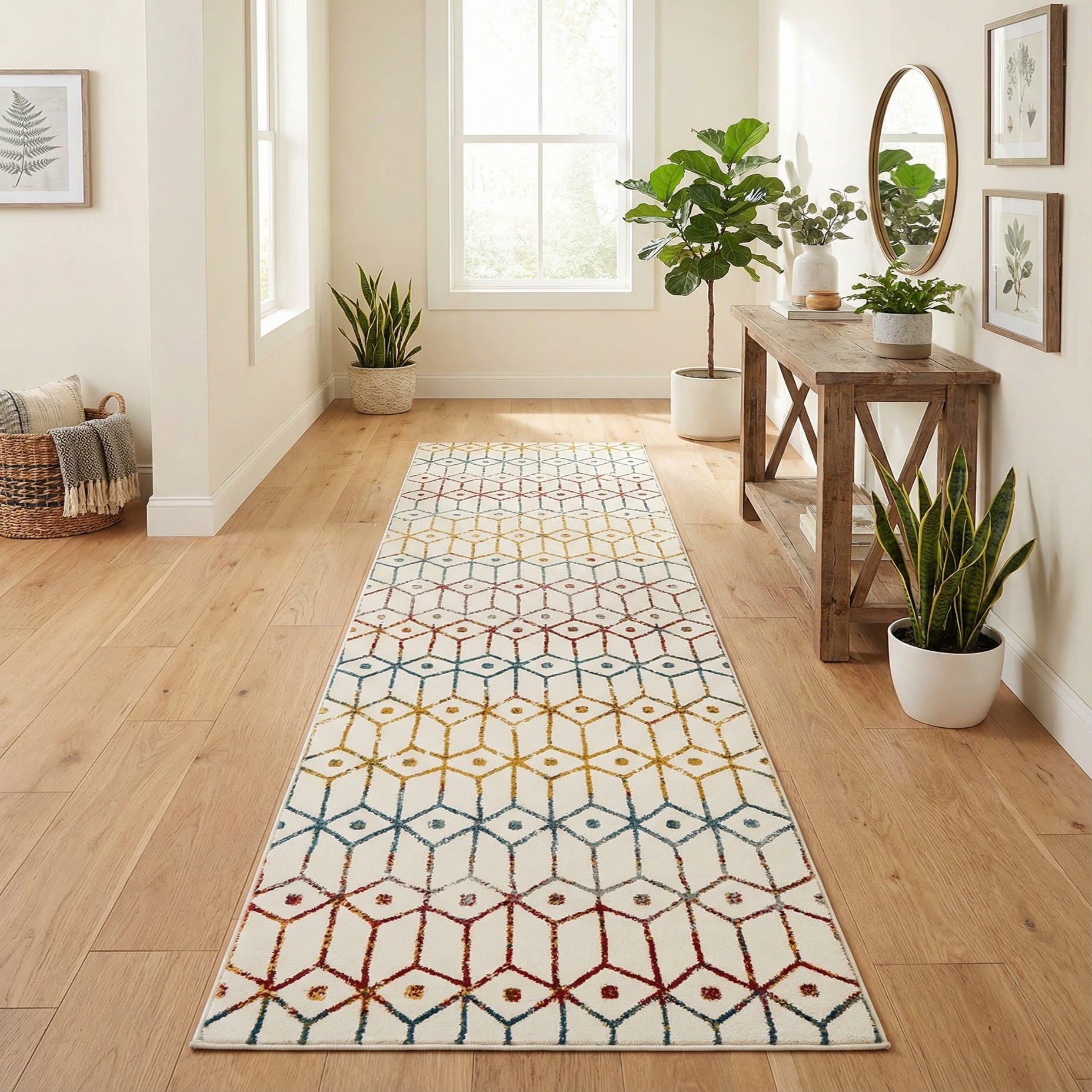 A 13 ft runner rug with a modern coastal pattern of multi-colored geometric lattices in red, blue, and yellow on a white background, perfect for a hallway.