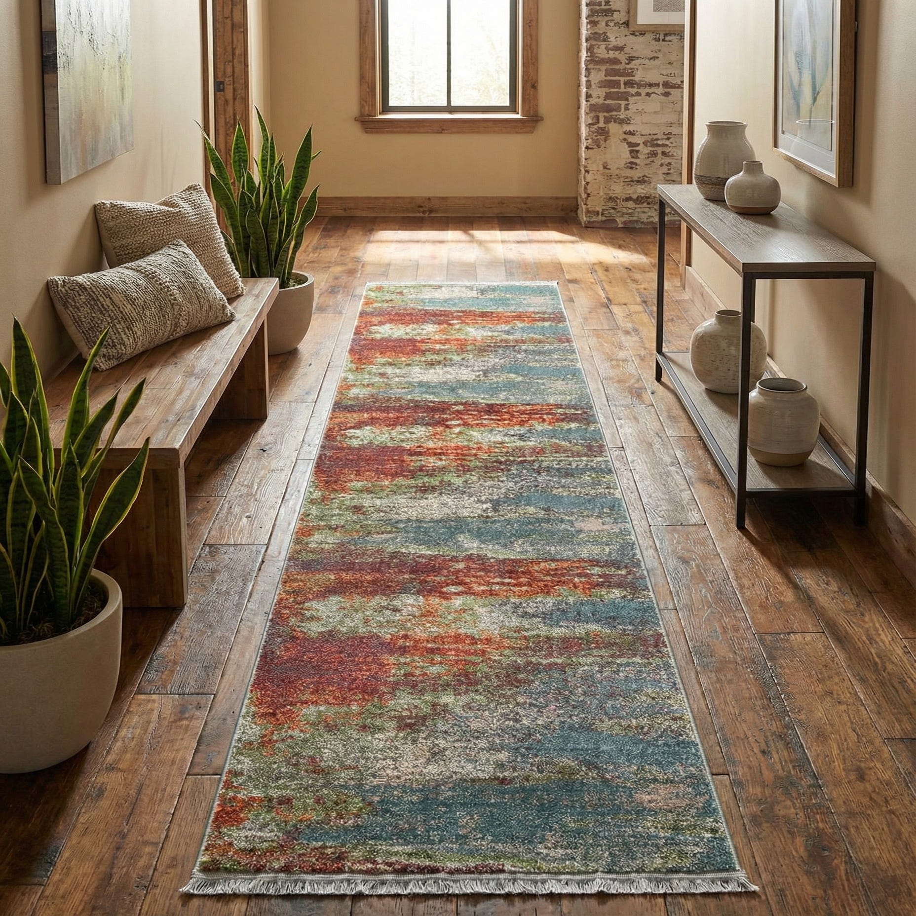 This runner works well in long, narrow spaces where you want color and movement without heavy ornament—hallways, entryways, kitchen aisles or alongside a bed. It pairs naturally with neutral upholstery and warm wood floors, and also complements bolder interiors that include navy, rust, or olive accents. Use it to add a painterly focal point to contemporary or transitional rooms, or layer it over a larger neutral rug in eclectic and modern farmhouse schemes for added depth and color.