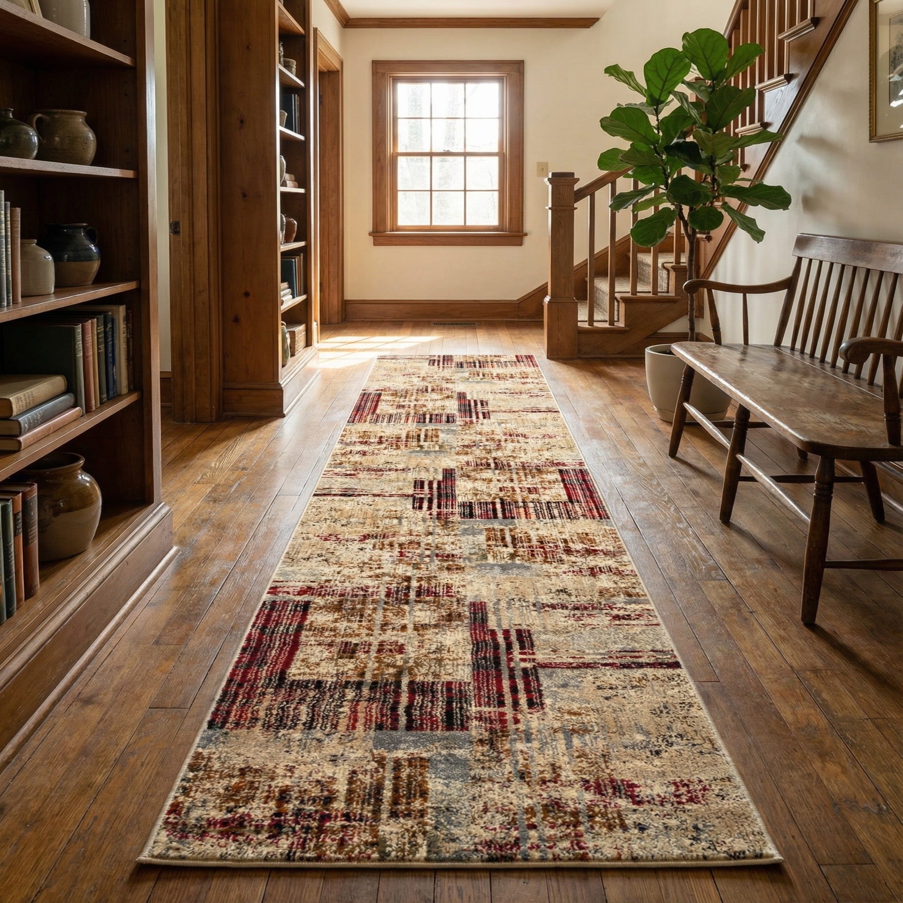 An abstract, contemporary runner with a layered, distressed motif that combines rectangular blocks and vertical striations across a multi background woven in warm beige. Accents of red, blue, gray, brown and black create rhythmic pops of color and visual texture, while areas of denser patterning give the surface subtle depth. The low-pile face has a slightly dense, smooth hand that feels even beneathfoot and highlights the pattern’s worn, graphic character.