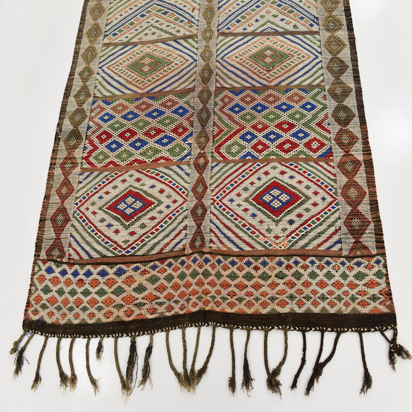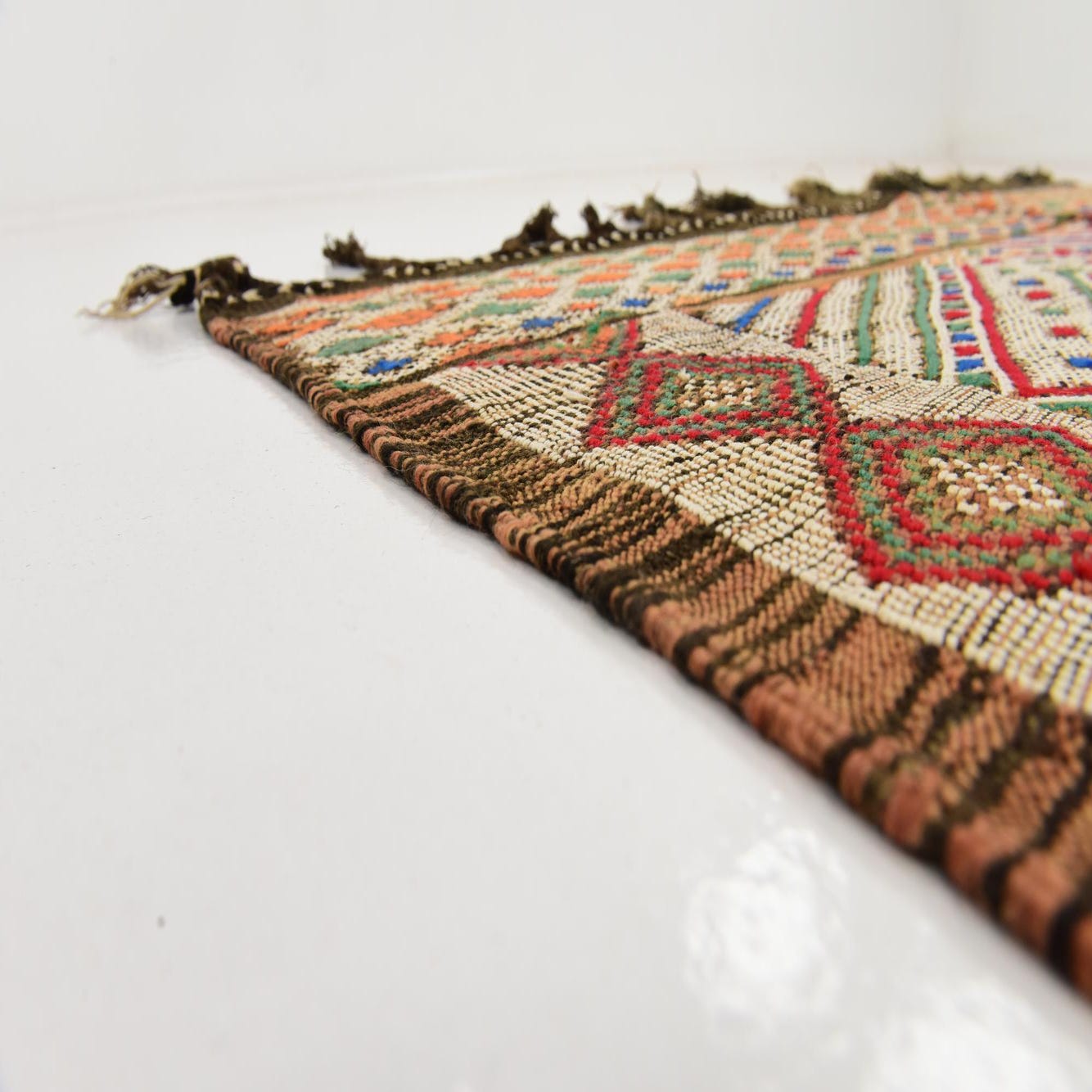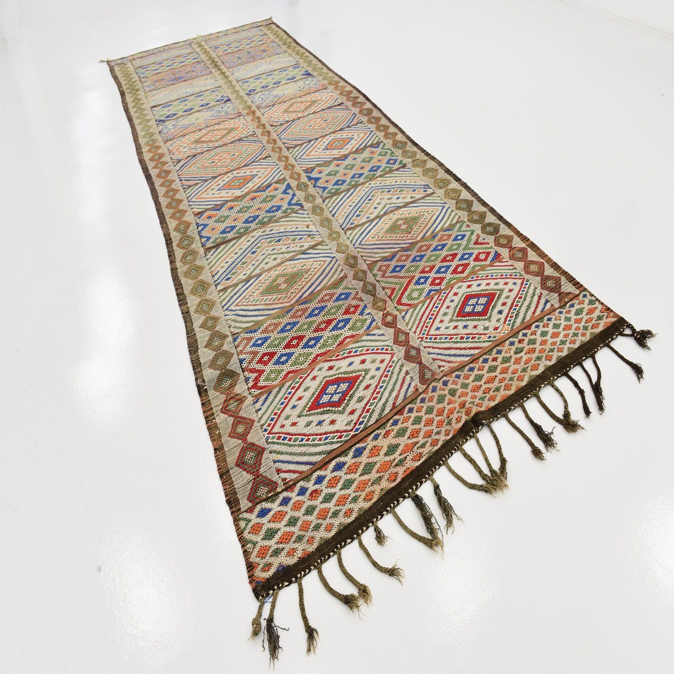 With its detailed patterning and rich colors, this runner can complement both traditional and eclectic decor schemes. It can coordinate with neutral interiors to introduce a pop of color or resonate with a more bohemian setting where its artisanal qualities will be appreciated. The fringe on either end adds an authentic finish, reinforcing its handcrafted heritage.