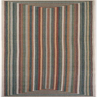 A linear, multi-striped runner with a concentric-rectangle border at each end, this outdoor rug combines narrow bands of brown, green, ivory, navy blue, red, rust and orange against an overall multi background. The pattern reads like a classic flatweave, with closely set stripes that create visual depth without a raised pile. Machine-made of 100% polypropylene, the construction produces a low-profile, tightly looped surface that offers a subtle, textured feel underfoot and a neat, tailored edge.