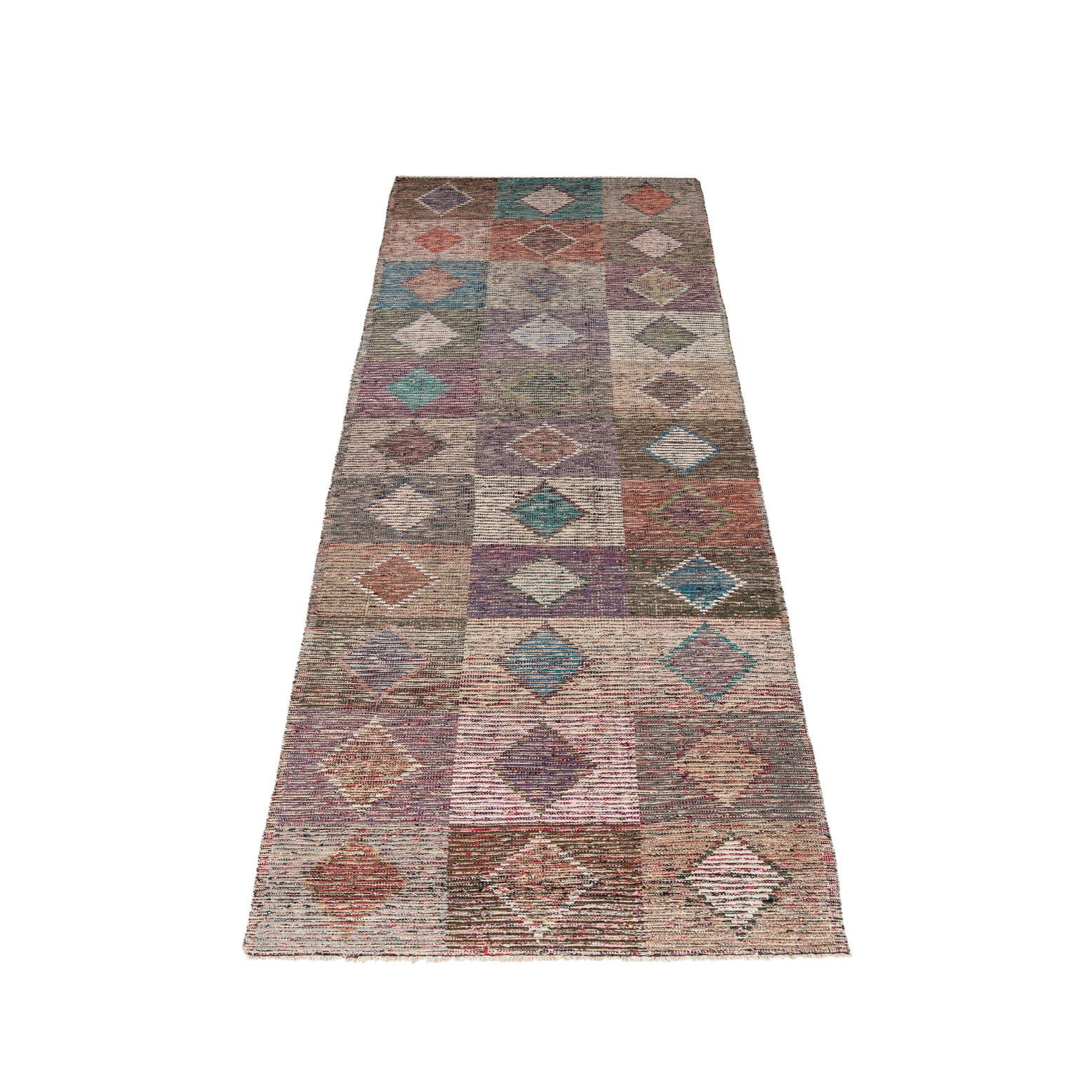 A 16 ft multi-colored wool runner rug with a tribal geometric pattern, featuring diamond shapes in various hues like teal, purple, red, and brown.