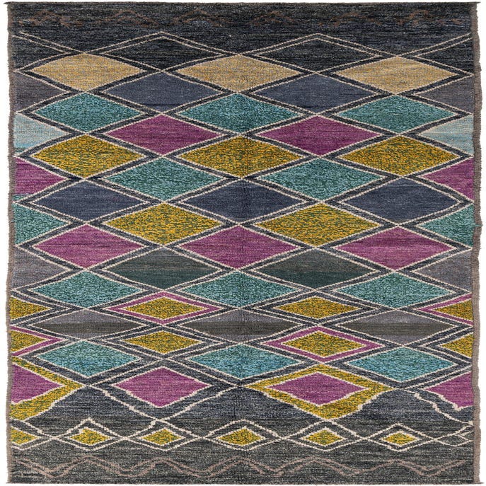 Primary color is Multi. Colors in this rug include: Multi, Gray, Green, Navy Blue, Purple, Teal, Yellow, Brown.