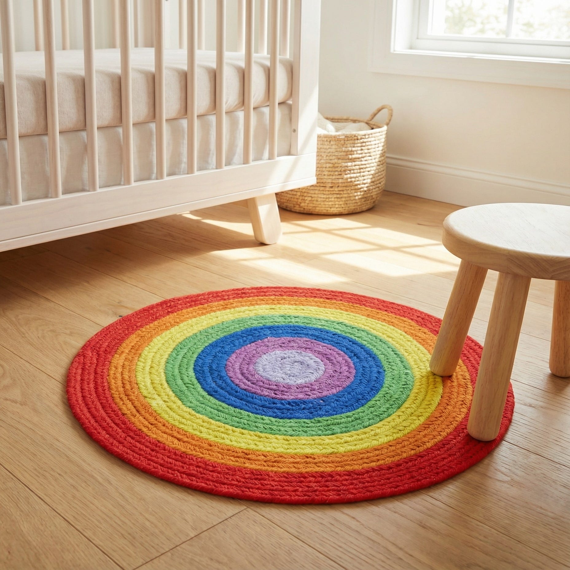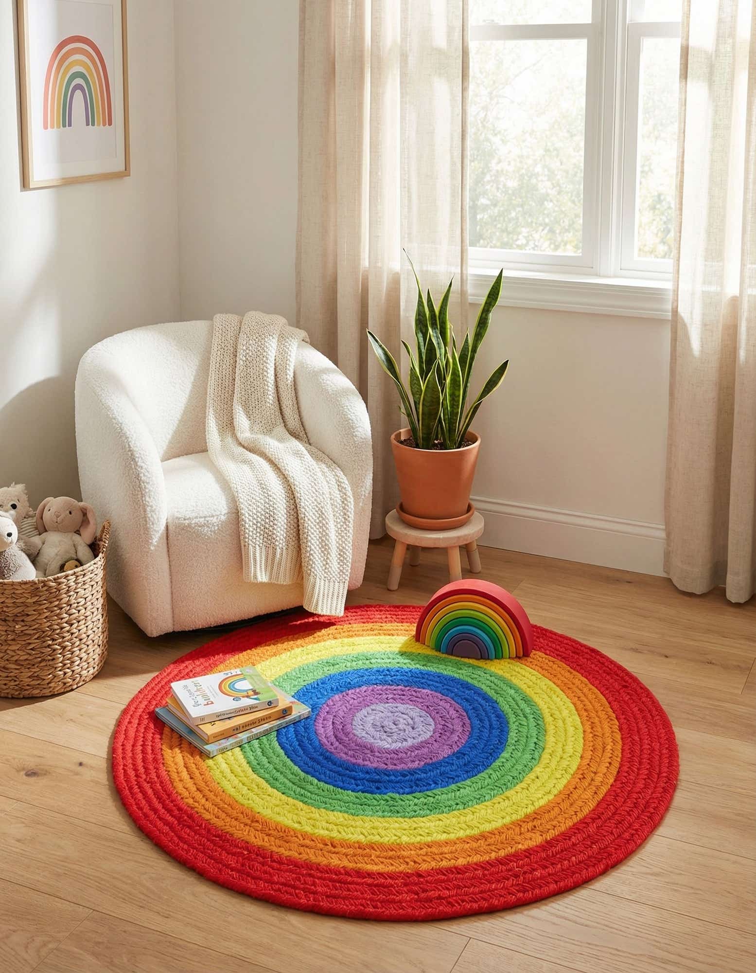 A vibrant 2' 0 x 2' 0 round braided wool rug with concentric rings of rainbow colors, perfect for a playful indoor space.