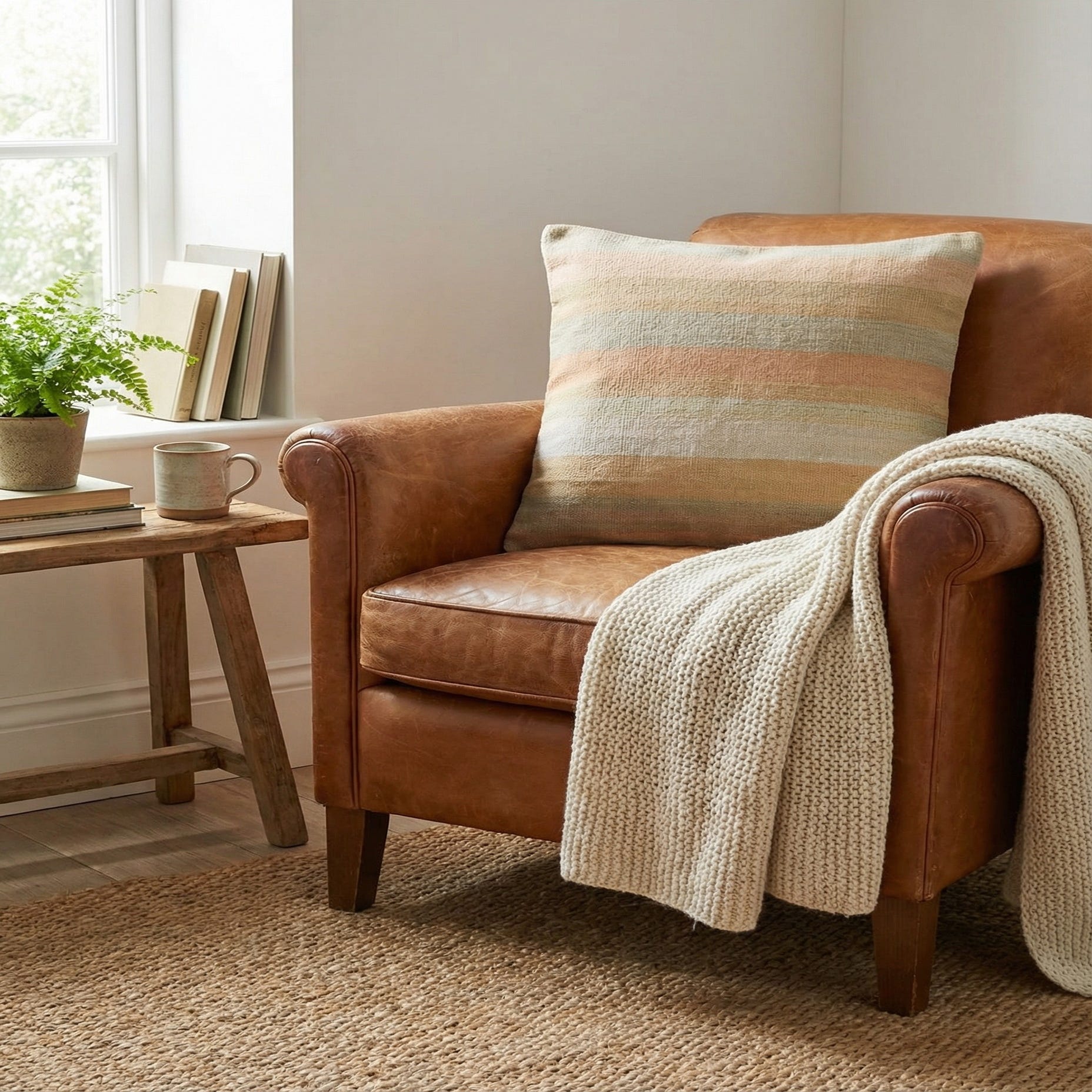 A square, multi-colored wool rug featuring horizontal stripes in muted tones of peach, beige, and light green.