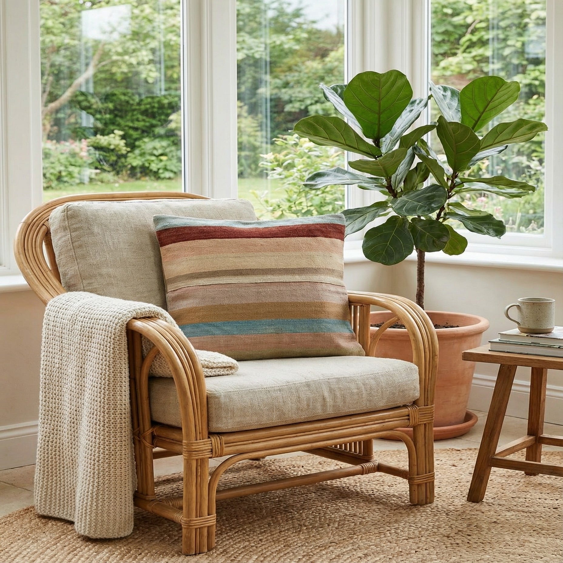 A square, multi-colored wool rug with horizontal stripes in shades of blue, rust, pink, and beige, showcasing its handmade texture.