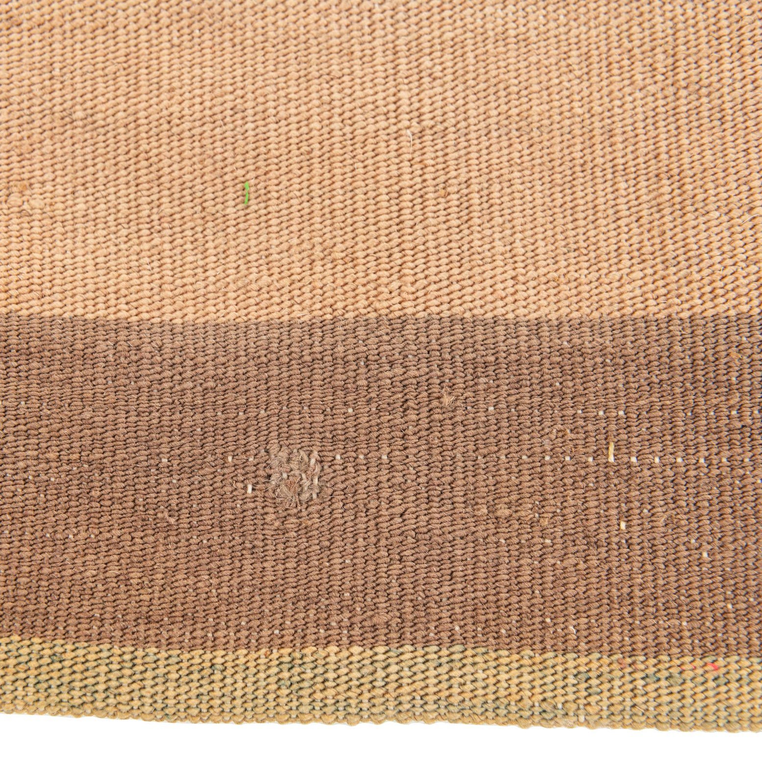 A square, multi-colored wool rug featuring horizontal stripes in shades of brown, beige, and terracotta, with a prominent dark brown stripe.