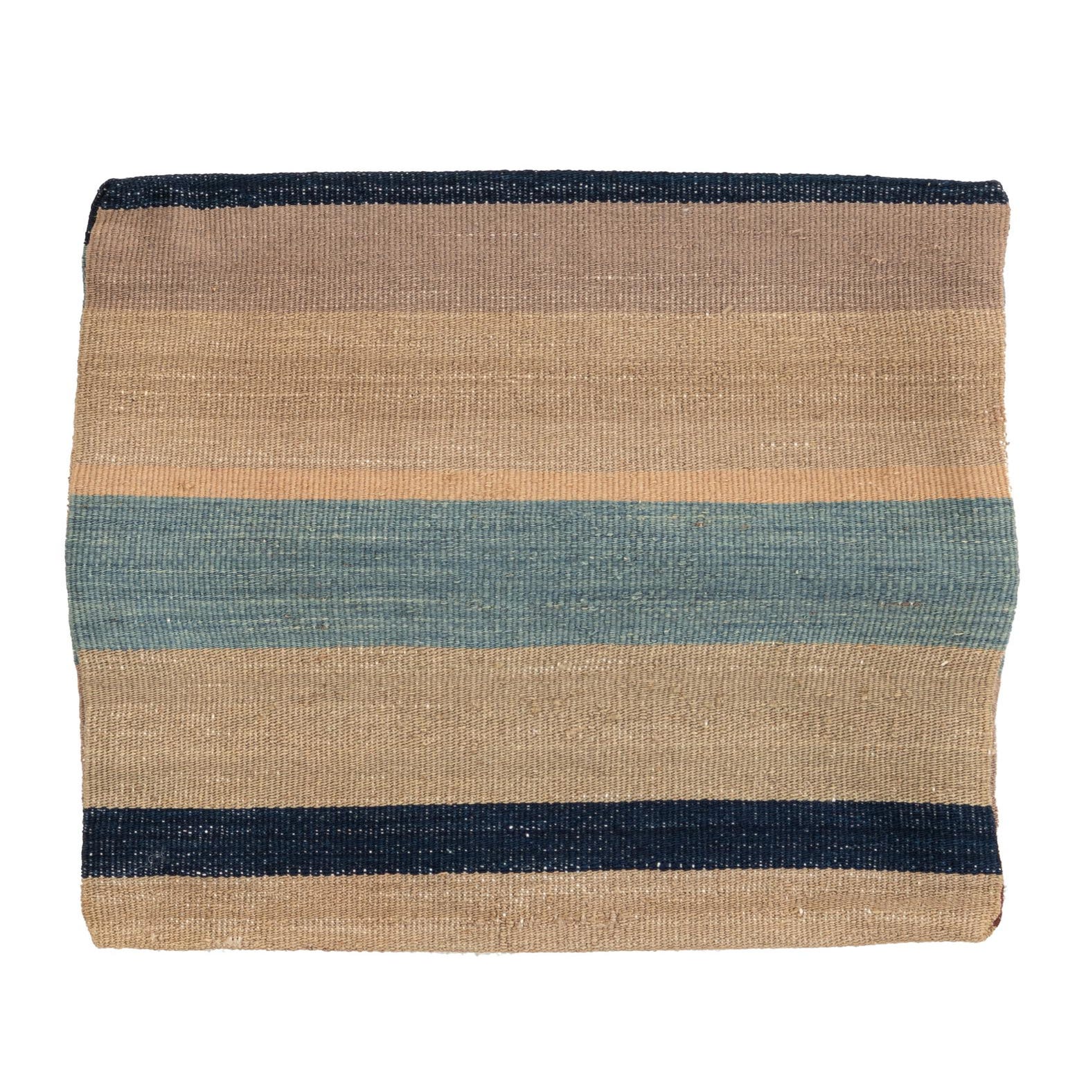 A square, multi-colored wool rug featuring horizontal stripes in varying shades of blue, brown, and beige.