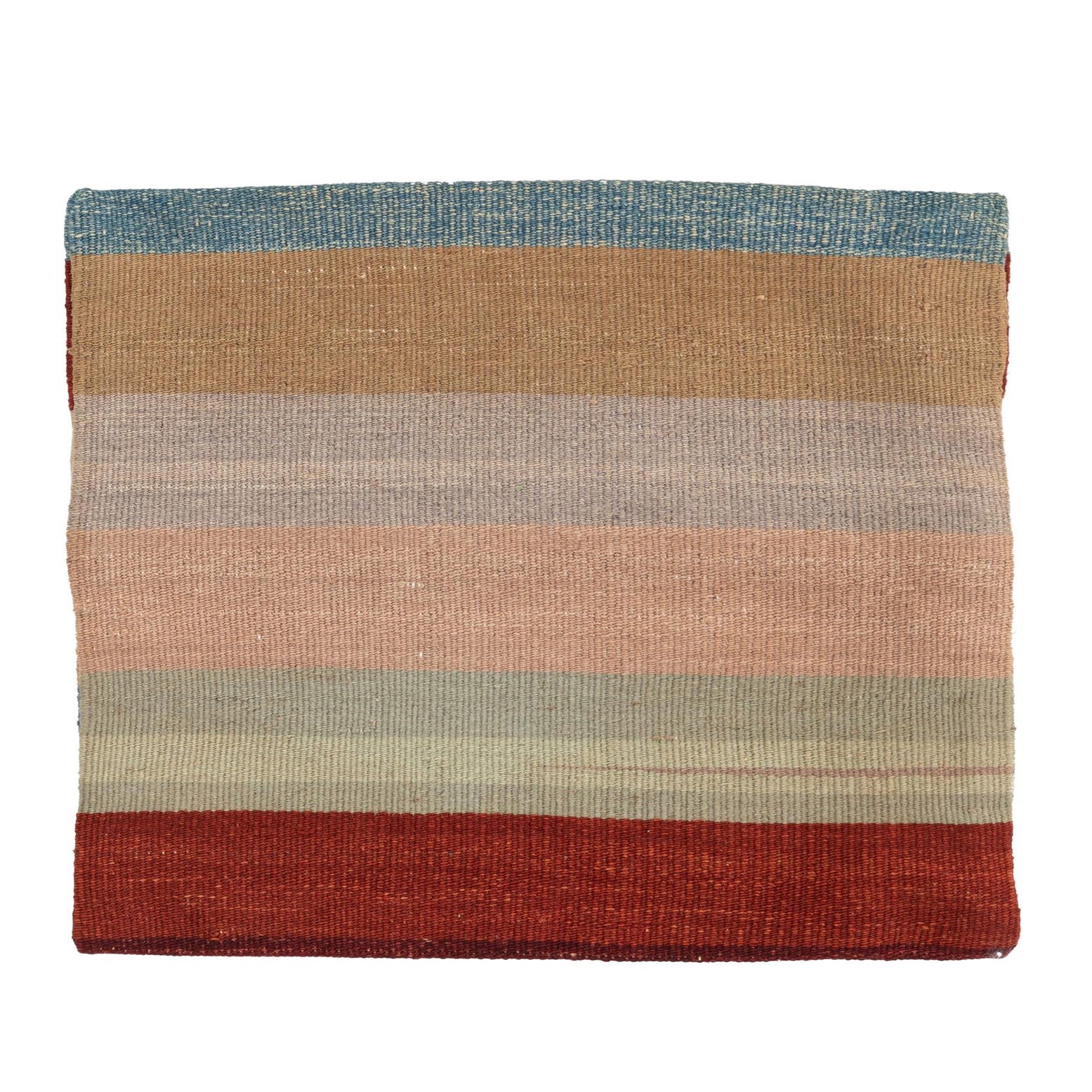A square, multi-colored wool rug with horizontal stripes in shades of blue, tan, grey, pink, green, and rust.
