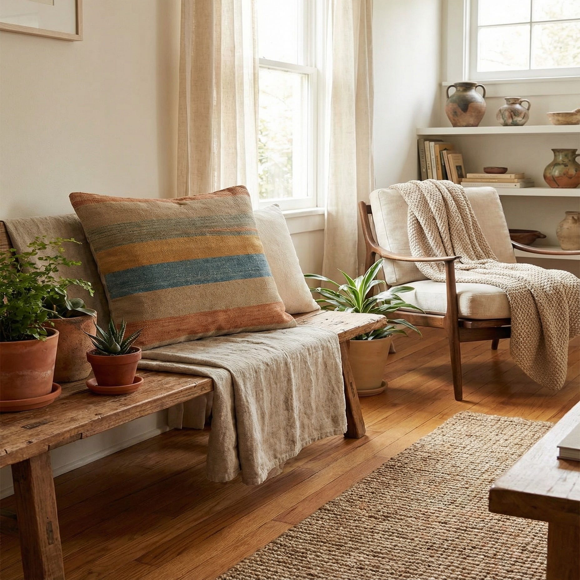 Use this piece as a lively accent in a living area—layered over a larger neutral rug or placed in front of a sofa—to introduce color without overpowering the room. It also works well in a sunroom, a reading nook, or beside a bed, and complements decor styles from coastal and Scandinavian to relaxed bohemian or transitional farmhouse when paired with linen upholstery, rattan, or warm wood furniture.
