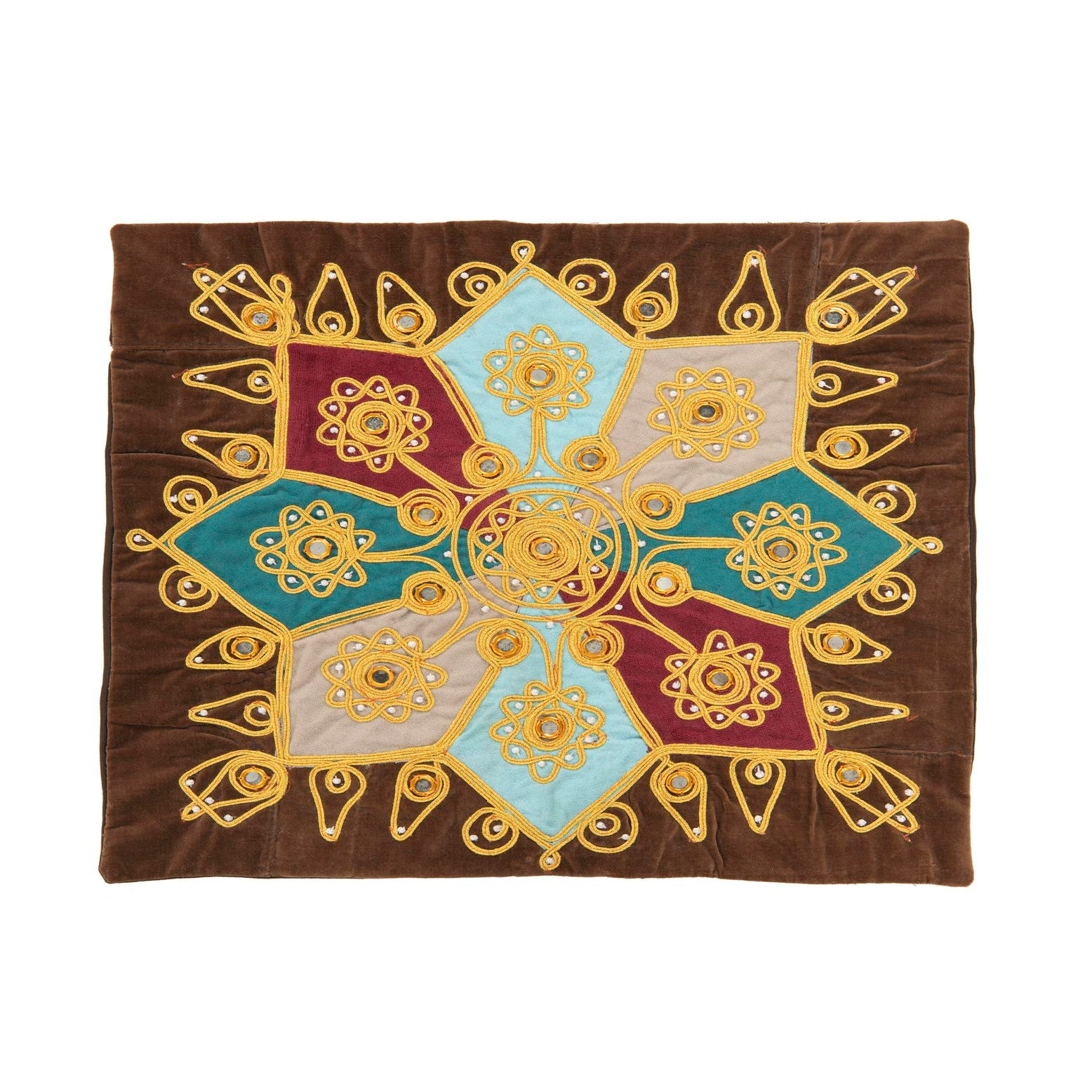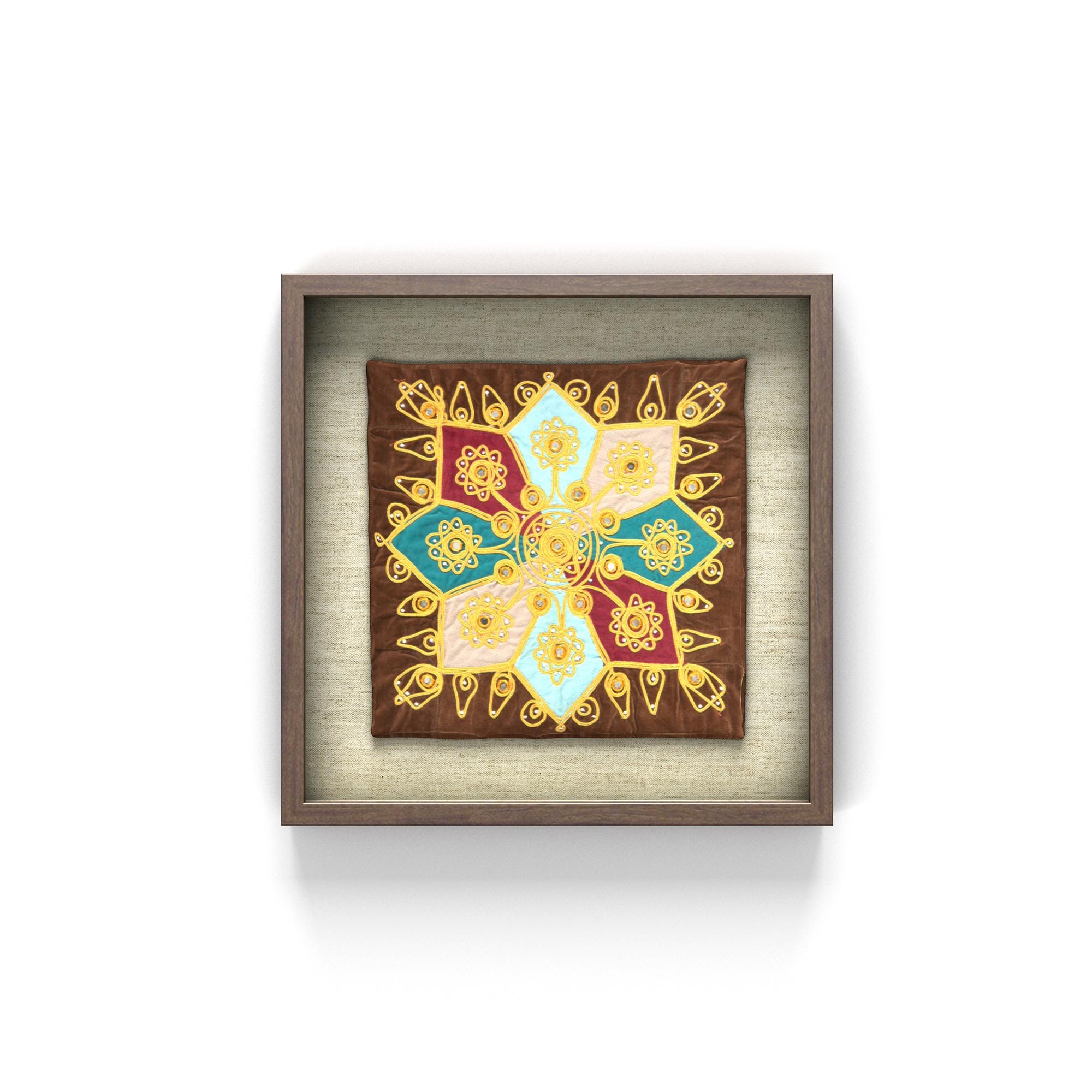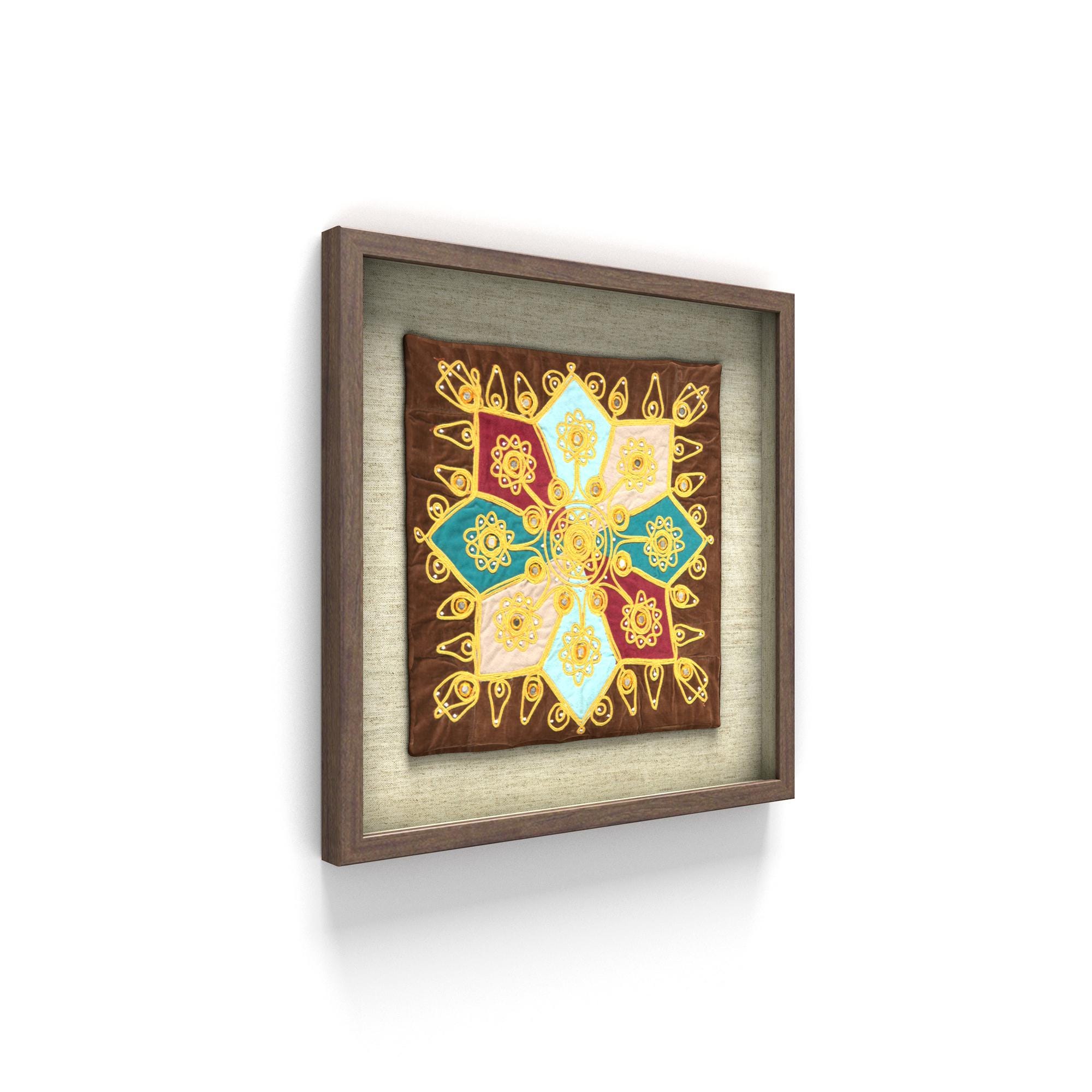 A framed 1' 5 x 1' 5 square multi-colored Textile Wall Art piece with a central medallion pattern in gold, teal, burgundy, and cream on a brown background.