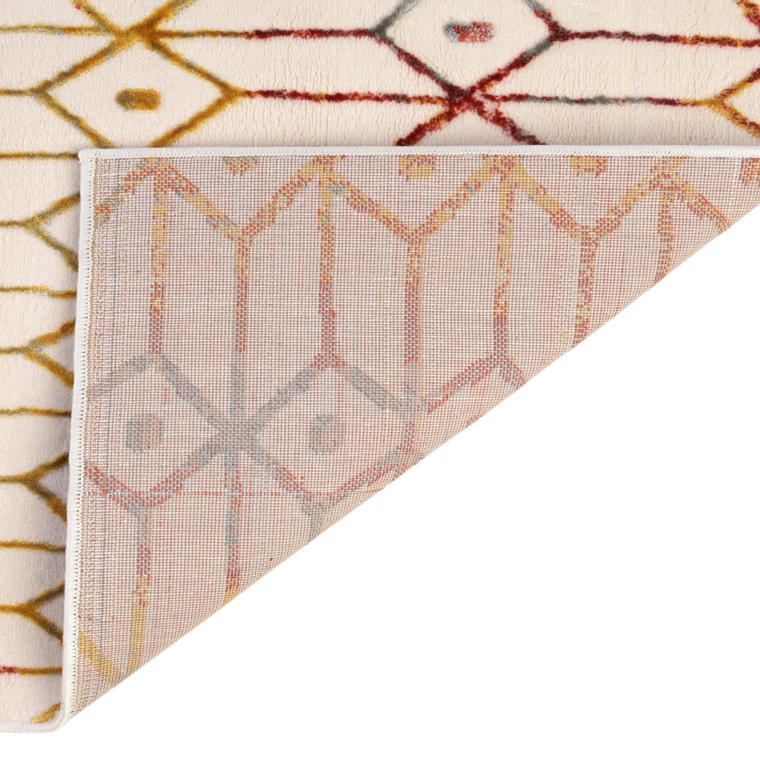 A repeating lattice of linked diamonds and tiny centered dots runs the length of this runner, creating a crisp geometric trellis that feels both structured and lively. Bands of blue, gray, red and yellow threads cross a multi-toned ground, producing a layered, hand-drawn look with pleasant visual texture. Machine-made from 100% polyester, the pile is soft with a subtle sheen and a low profile that feels comfortable underfoot and lays smoothly in narrow spaces.