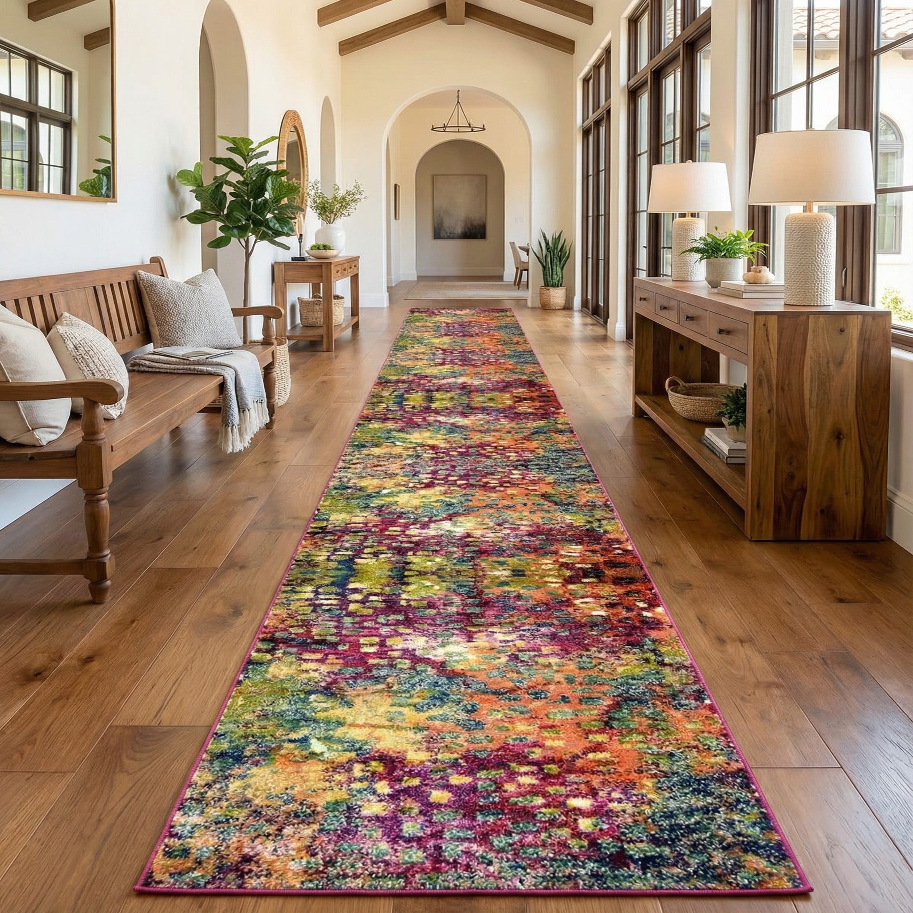 An energetic, abstract pattern of pixelated clusters and painterly color washes gives this runner a lively, contemporary look. The multi background carries a layered palette—cream, light blue and navy provide cool depth while gray and gold add balance, and brighter notes of green, burgundy, orange, purple, violet and pink pop across the surface. The design reads like a modern art composition, with small, grid-like motifs breaking up softer color fields for a textured visual rhythm that draws the eye down a corridor.