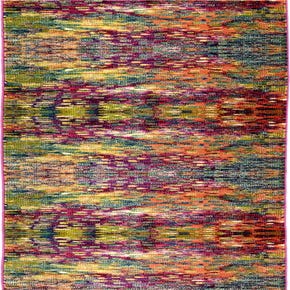 An energetic, abstract pattern of pixelated clusters and painterly color washes gives this runner a lively, contemporary look. The multi background carries a layered palette—cream, light blue and navy provide cool depth while gray and gold add balance, and brighter notes of green, burgundy, orange, purple, violet and pink pop across the surface. The design reads like a modern art composition, with small, grid-like motifs breaking up softer color fields for a textured visual rhythm that draws the eye down a corridor.