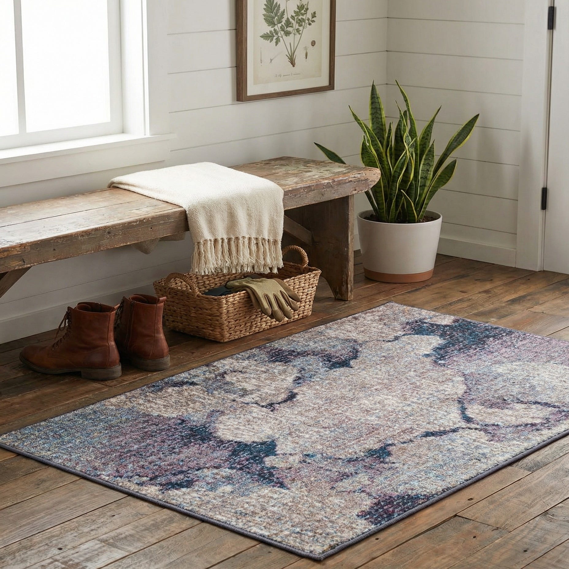 Primary color is Multi. Colors in this rug include: Multi, Beige, Ivory, Gray, Blue, Light Blue, Navy Blue, Purple.