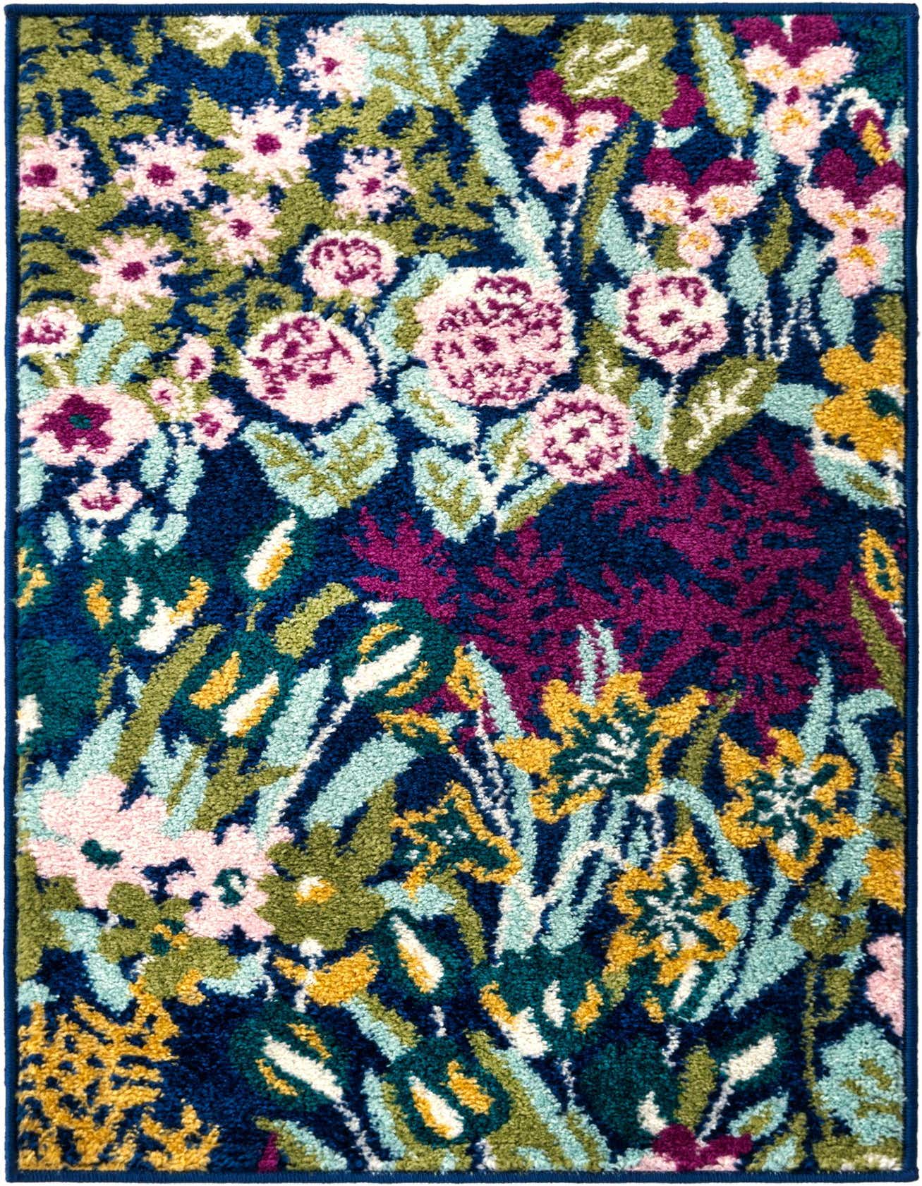 The Bloom collection 2x3 rug showcases a vibrant floral pattern that instantly enlivens any space. This machine-woven piece is crafted from 100% polypropylene, ensuring durability and easy maintenance. The rug's surface presents an array of colors, including green, ivory, light blue, purple, pink, yellow, navy blue, and teal set against a multi-colored background, creating a rich tapestry of hues that can complement a variety of interior palettes.