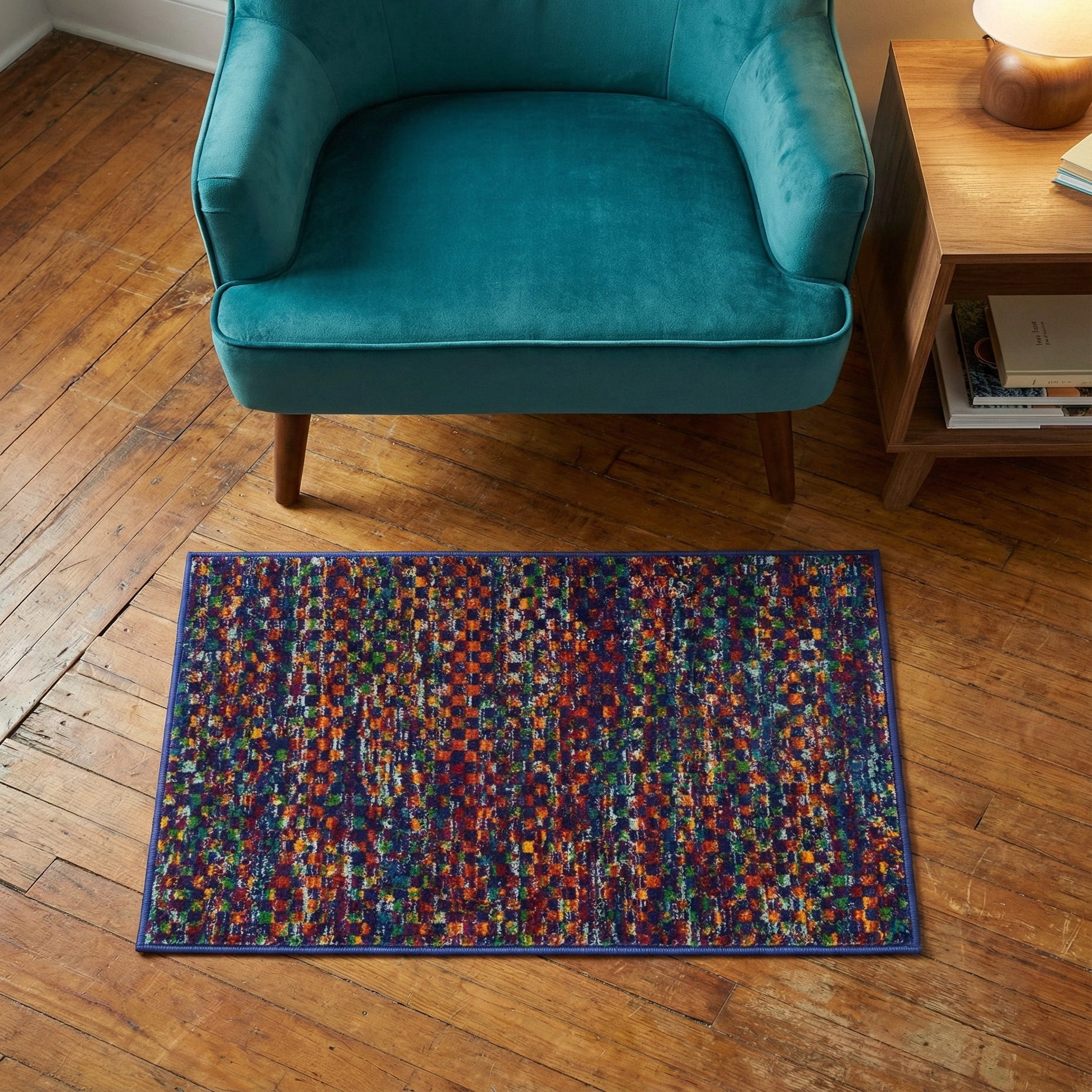 This compact accent works well in a variety of settings: place it at an entry, beside a bed, under a reading chair, or layer it over a larger neutral rug to add color and pattern. It pairs particularly well with contemporary and midcentury pieces, bohemian interiors that welcome bold hues, or playful, kid-friendly rooms. Combine it with solid upholstery and warm wood tones to let the rug’s vibrant geometry take center stage, or echo its colors in cushions and art for a coordinated, energetic look.