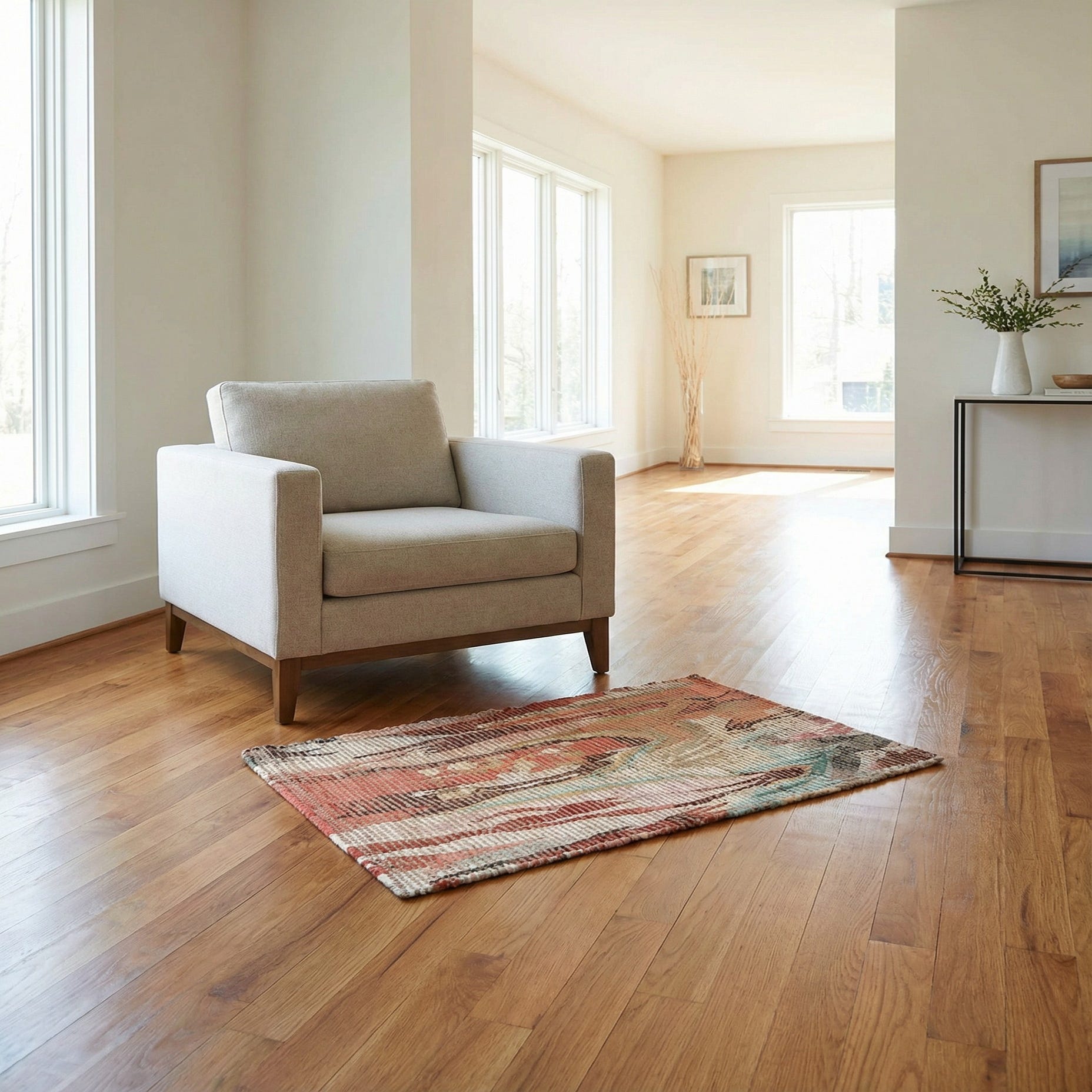 A 2x3 rectangular Rugs.com Chenille Jute rug featuring a modern, abstract multi-colored pattern with shades of orange, red, blue, and brown.