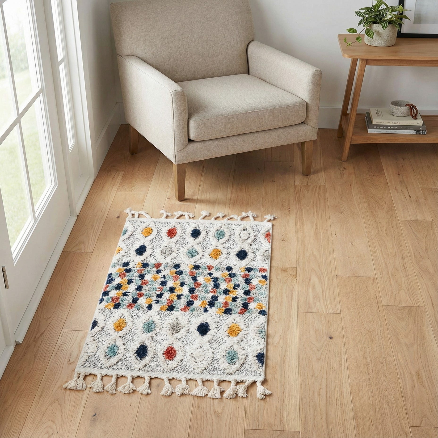 A lively, hand-crafted look rendered in machine-made durability, this rug pairs a multi-tonal background of ivory and gray with a layered pattern of raised oval medallions and a central band of clustered, multicolored tufts. Navy blue, bright blue, yellow and red pops sit inside a soft diamond lattice, while the contrasting high-low pile and fringed ends add tactile interest. Machine made of 100% polypropylene, the surface reads plush and slightly chunky where the tufts rise, with a lower, denser base that gives the pattern clear definition and a comfortable hand underfoot.