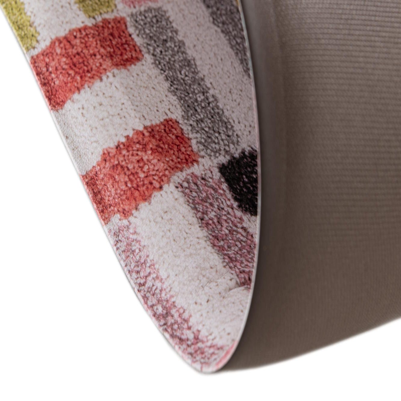 A 2x3 rectangular multi-colored modern rug with a high pile, featuring a playful geometric pattern of pink, yellow, blue, red, and grey blocks on a white background.