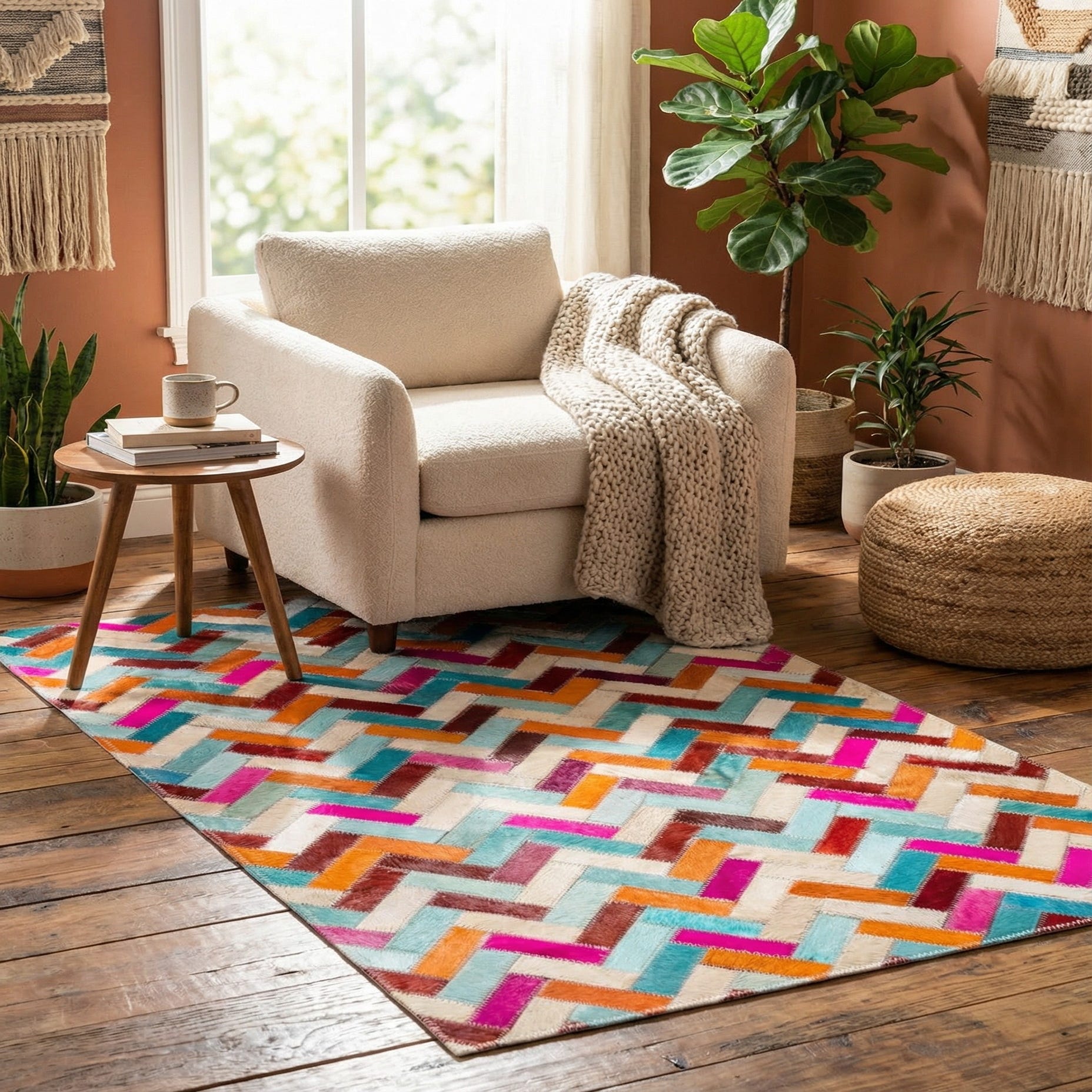 This Cowhide piece, due to its the diverse color scheme, can easily become the focal point in a minimalist or contemporary setting, drawing the eye and adding a pop of color without overwhelming the space. Alternatively, it could be seamlessly integrated into a maximalist decor style, where its pattern and vivid hues would mesh well with an eclectic mix of textures and colors. The durable nature of the materials ensures that the rug is suitable for moderate traffic areas, such as private offices, boutique waiting areas, or residential entryways.