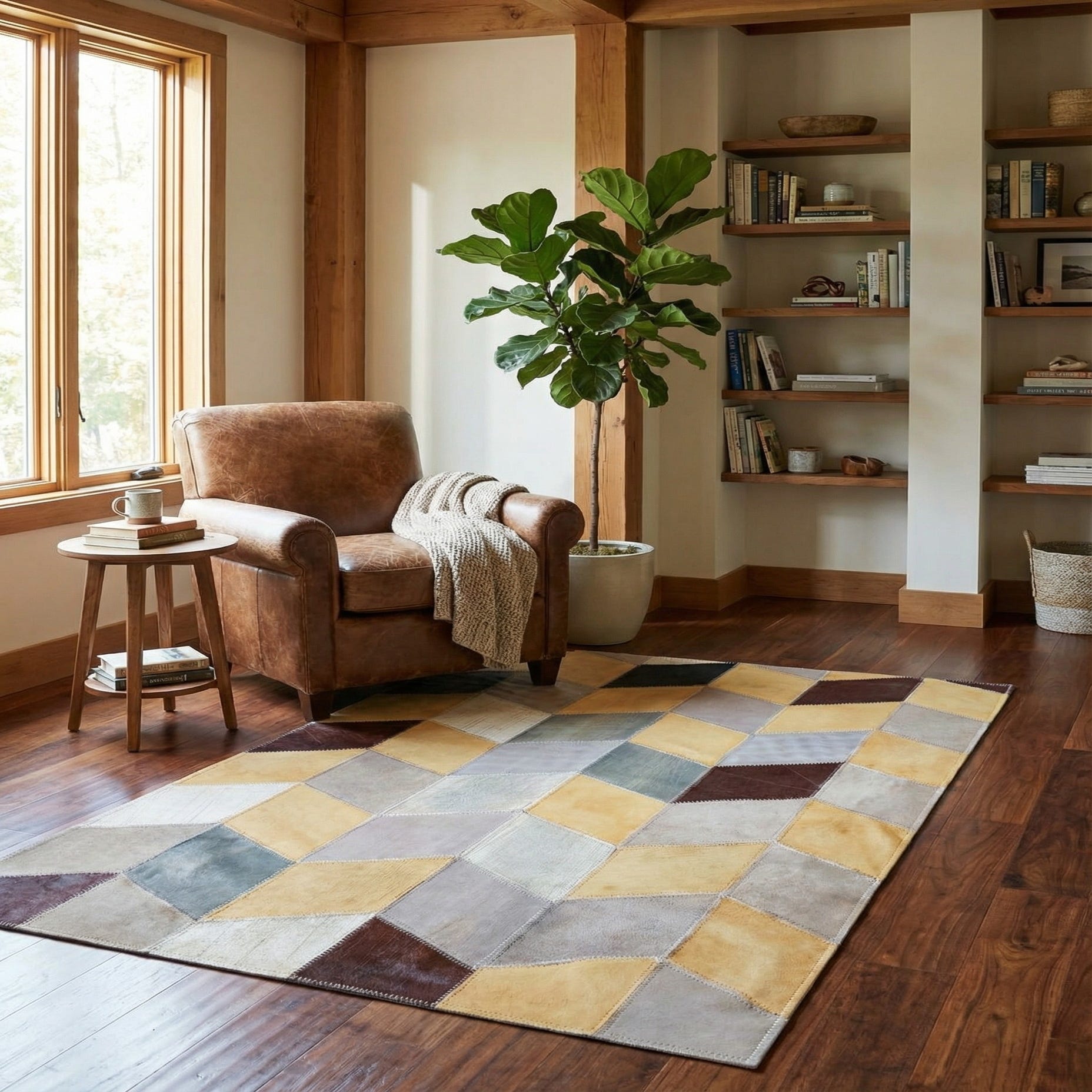 A 2x3 rectangular Cowhide Leather rug featuring a modern chevron pattern in multi-colored patches, perfect for an entryway.