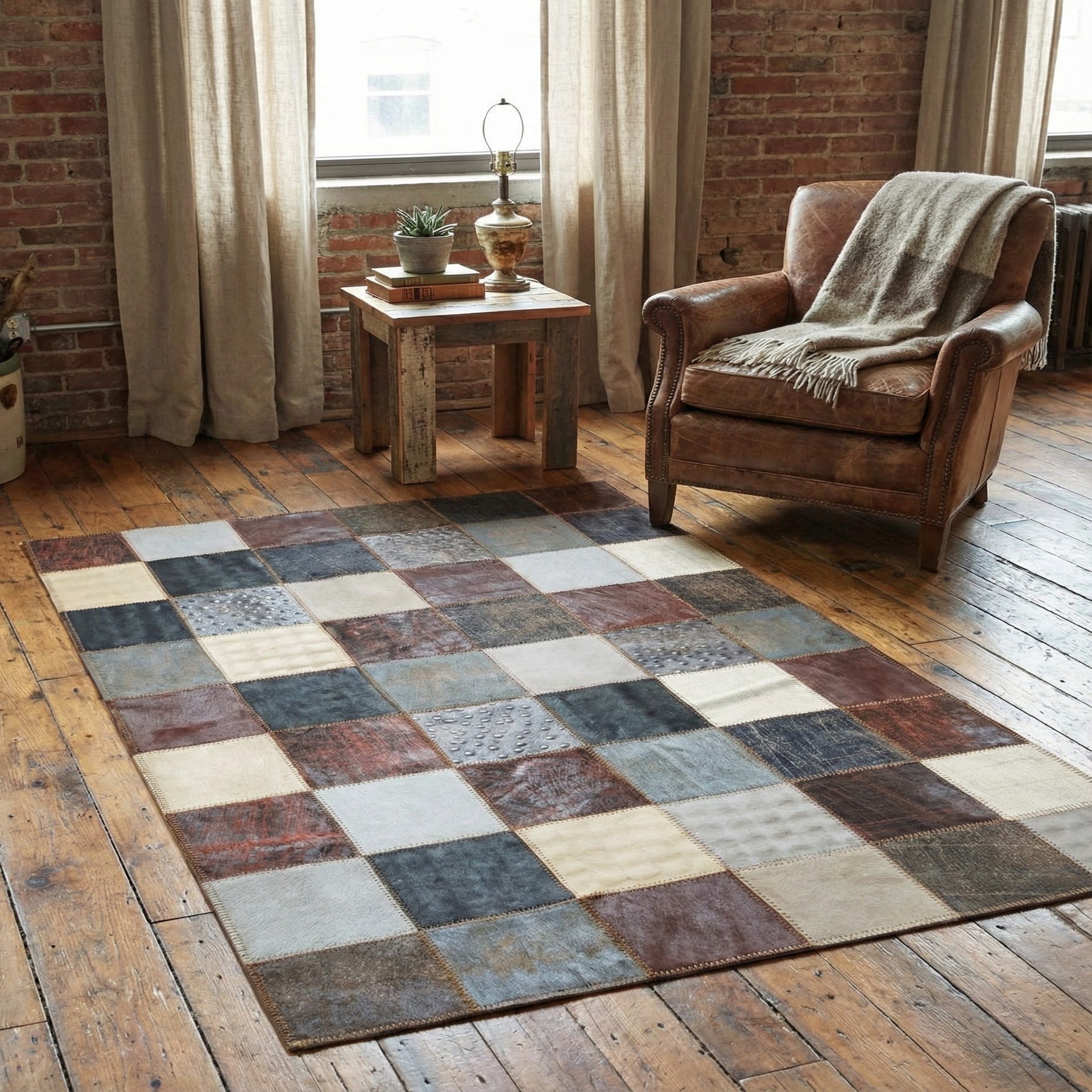 The leather and cowhide construction yields a firm yet supple feel with clear surface variation and a low-pile profile that layers easily over hard floors. Use this rug to anchor a small seating area, set in front of a writing desk, or place beneath an entry bench for an immediate style detail. It pairs especially well with warm woods, industrial metal accents, leather upholstery, and layered textiles in neutral or jewel tones for a lived-in, tailored look.