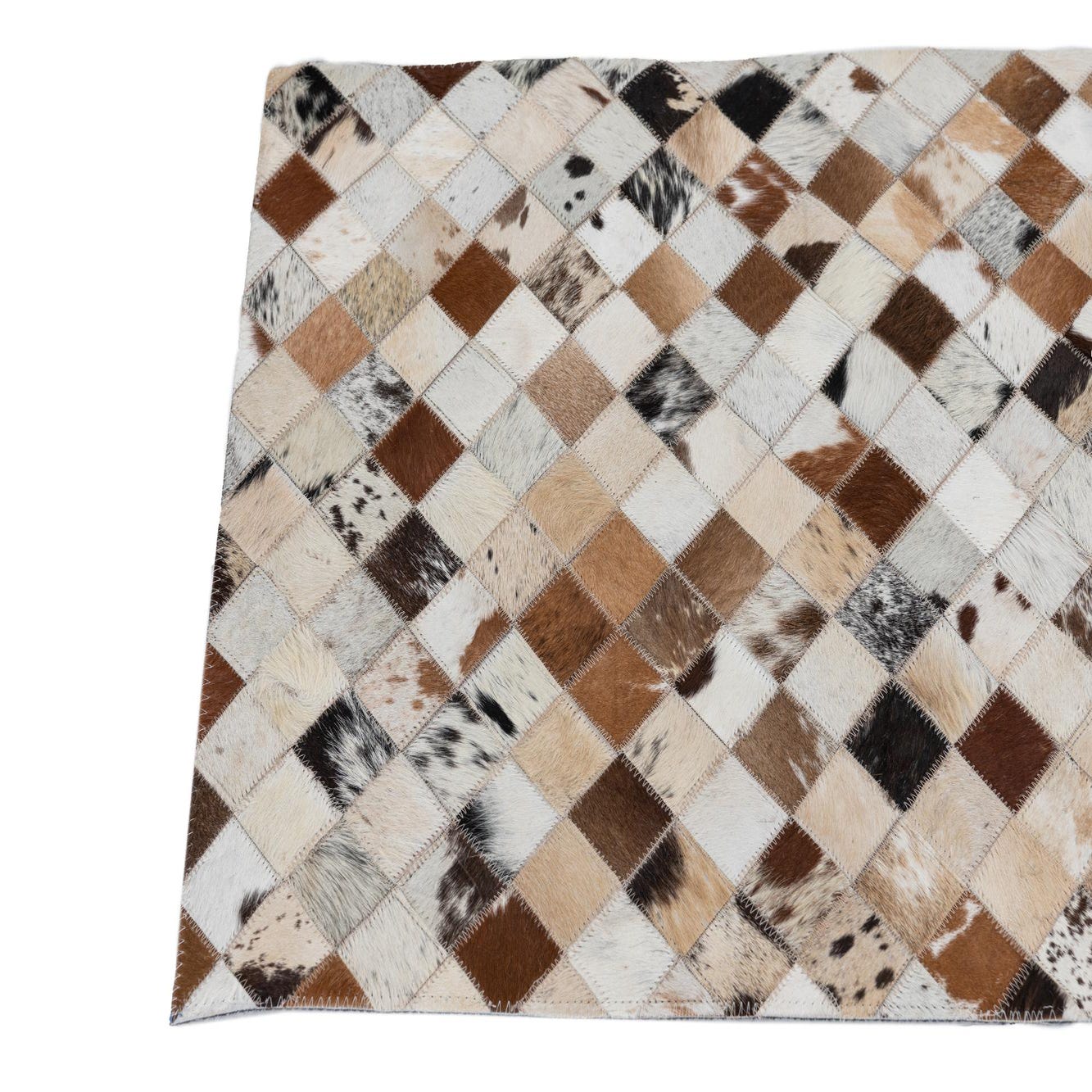 2x3 rectangular Cowhide Leather rug featuring a patchwork of multi-colored diamond-shaped cowhide pieces in various brown, white, and black tones.