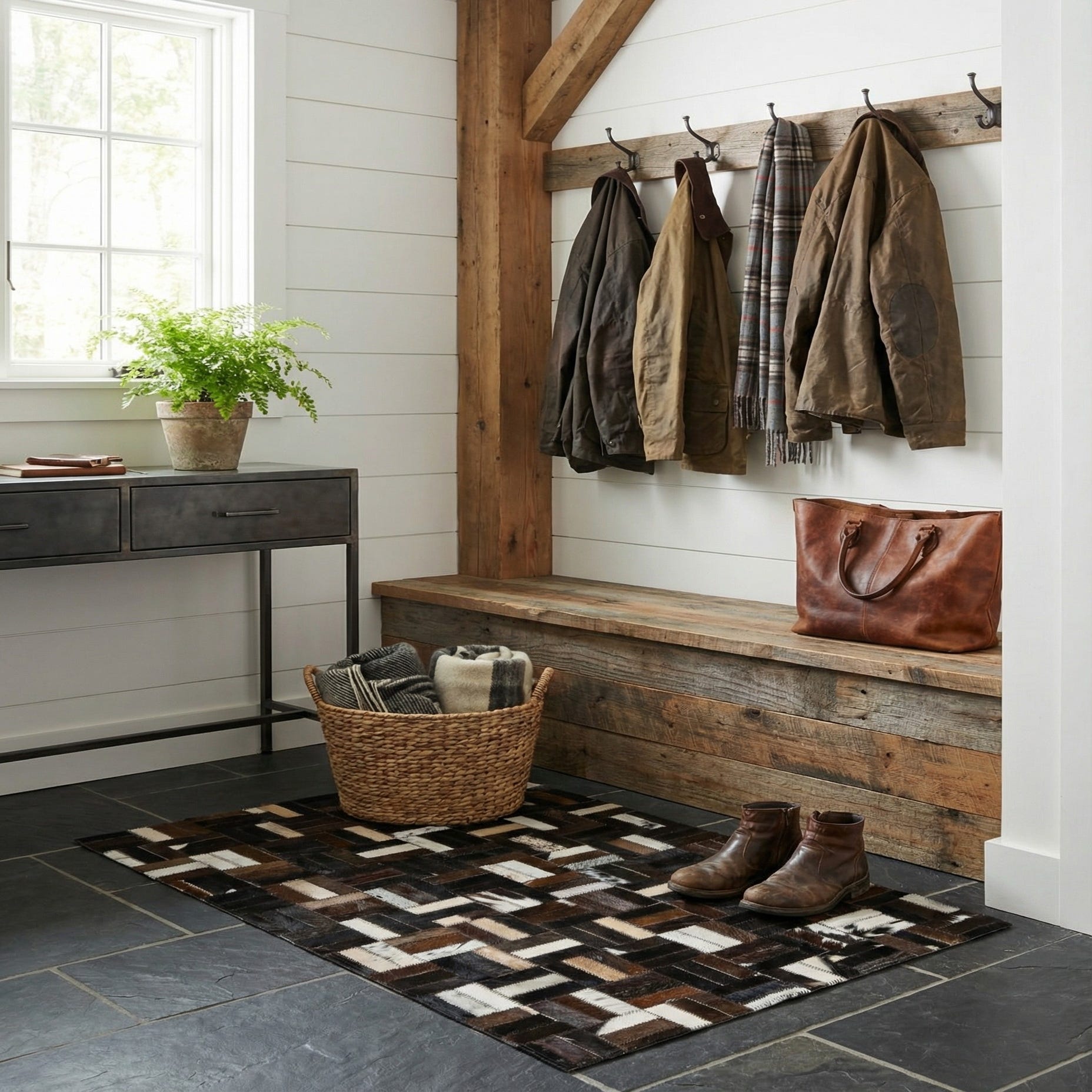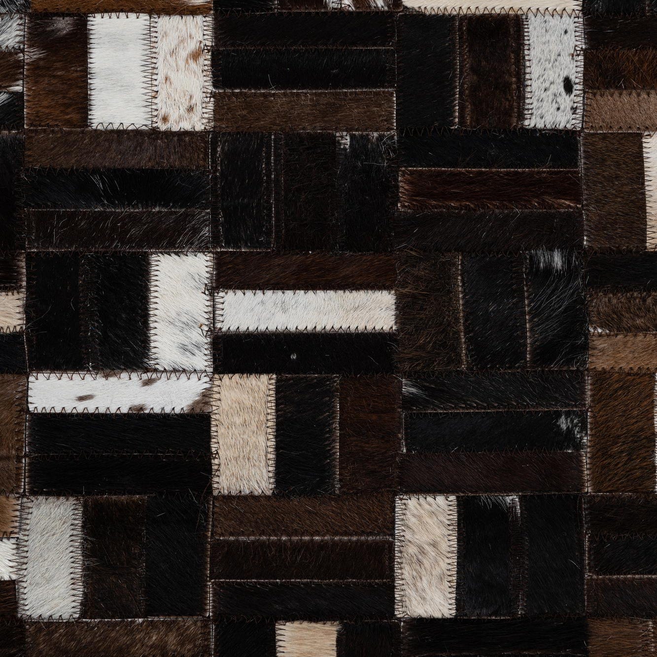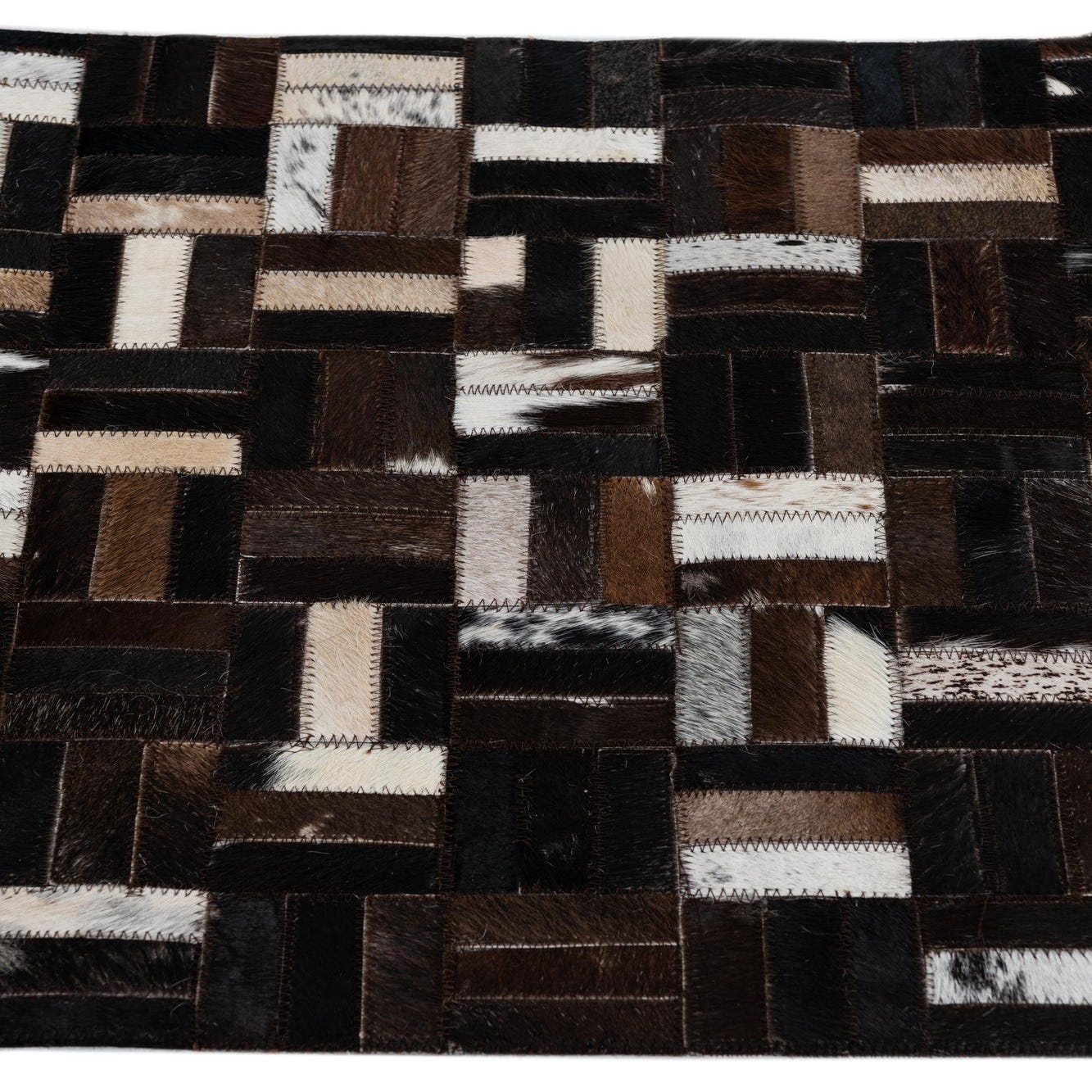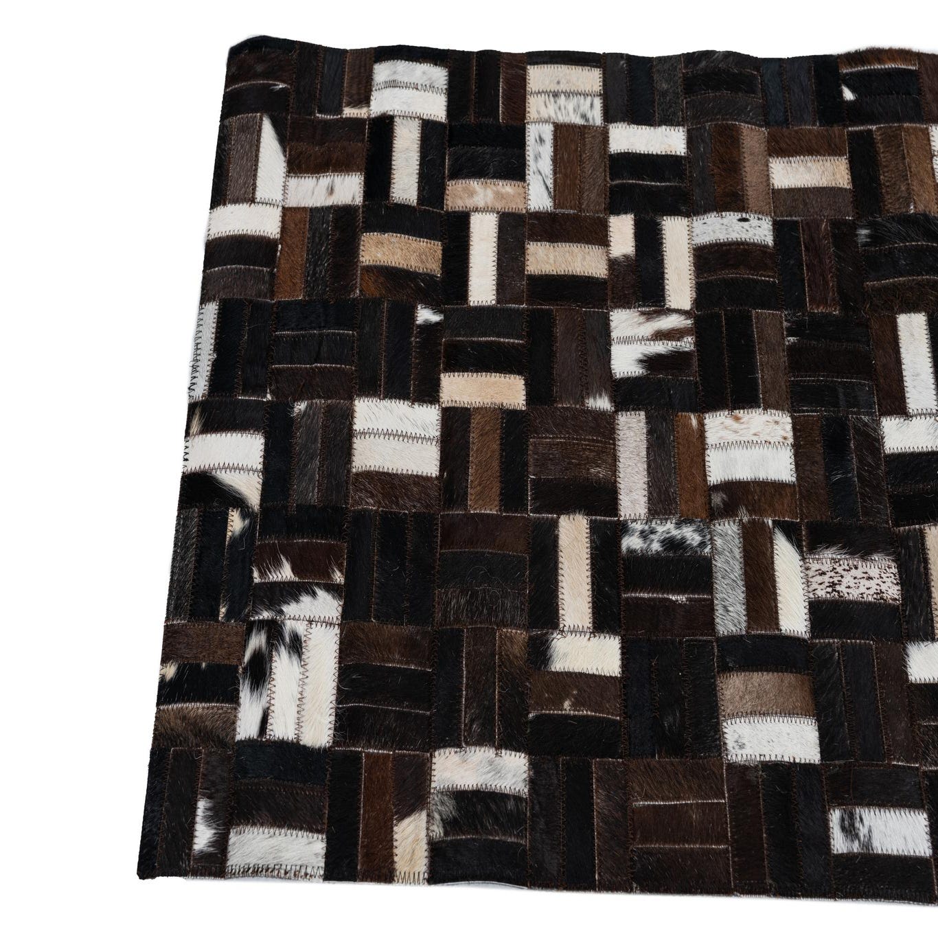 2x3 rectangular Cowhide Leather rug featuring a modern patchwork of multi-colored natural cowhide squares and rectangles in shades of brown, black, and white.