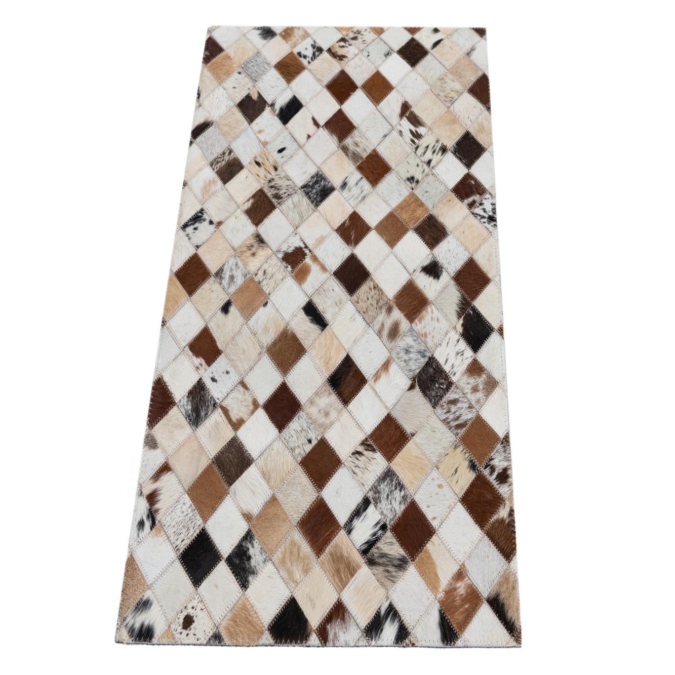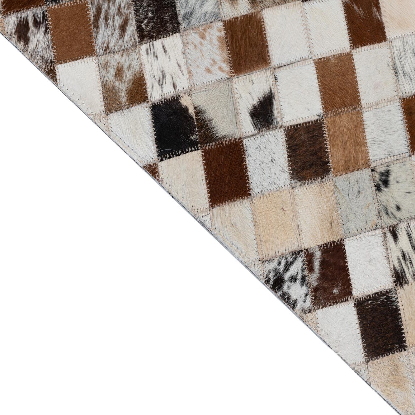 A 2x3 rectangular Cowhide Leather rug featuring a modern patchwork of multi-colored natural cowhide squares in various shades of brown, white, and black.