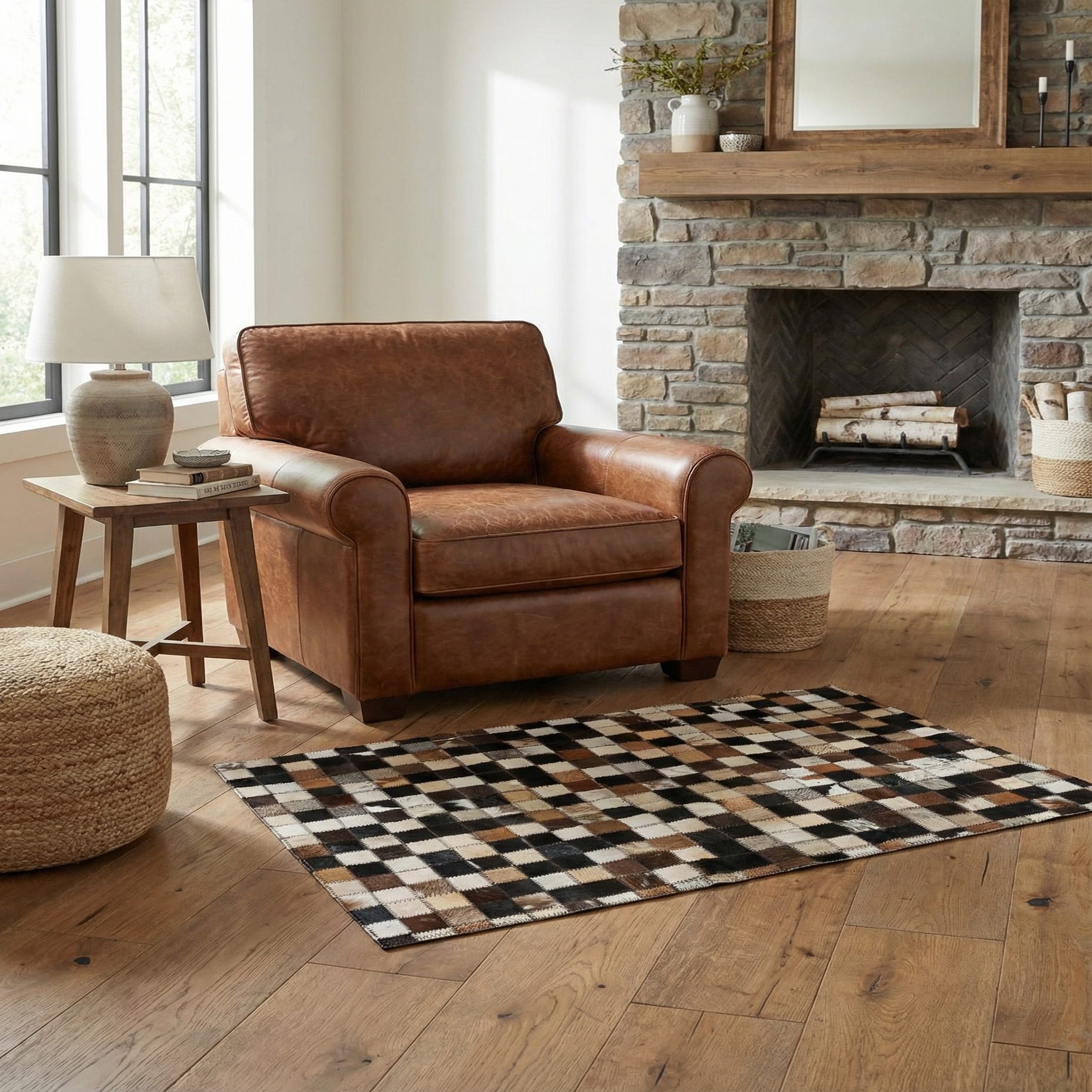 A 2x3 rectangular modern cowhide rug with a multi-colored patchwork pattern in shades of brown, black, and white.