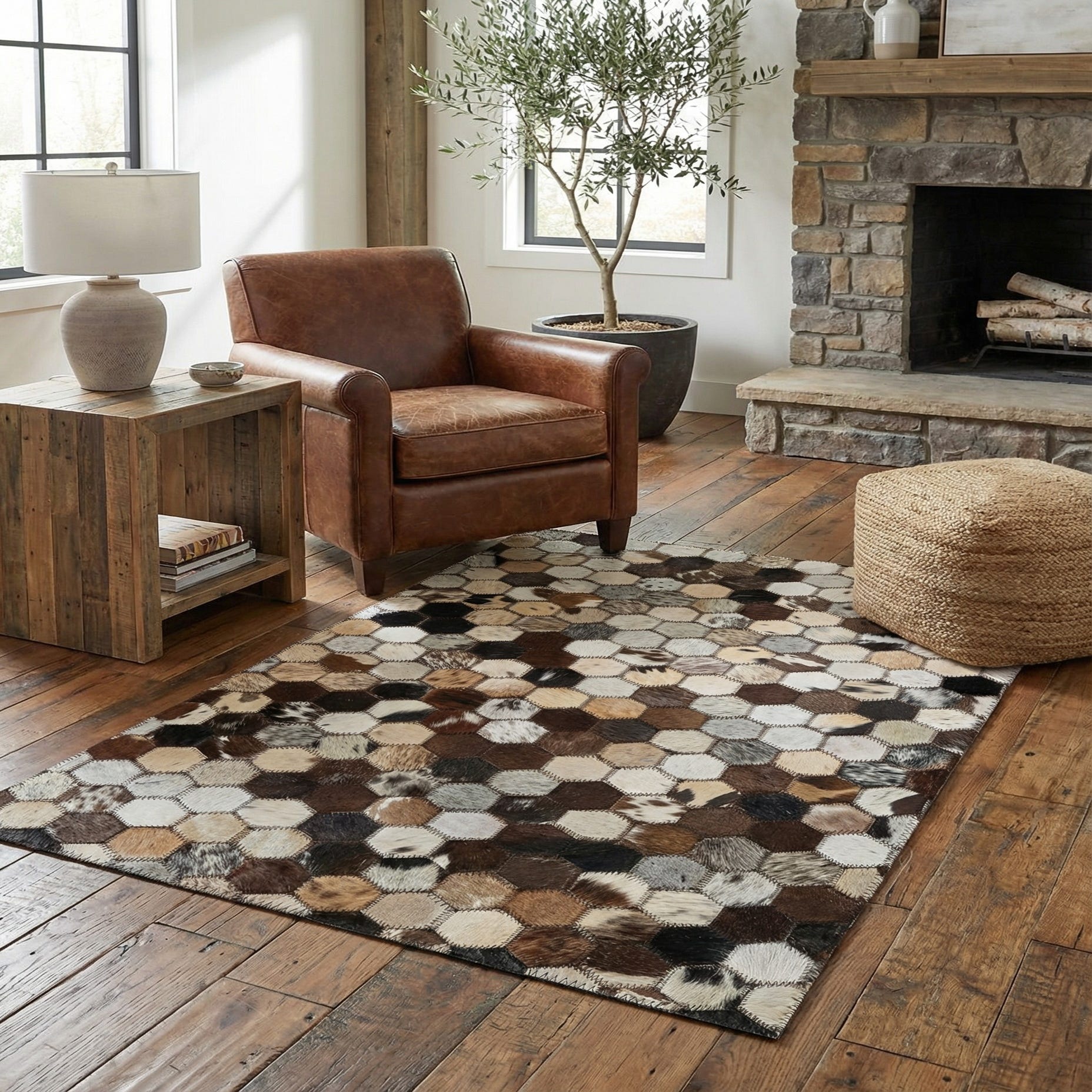 A 2x3 rectangular Cowhide Leather rug featuring a modern patchwork of hexagonal multi-colored cowhide pieces in various natural browns, creams, and grays.
