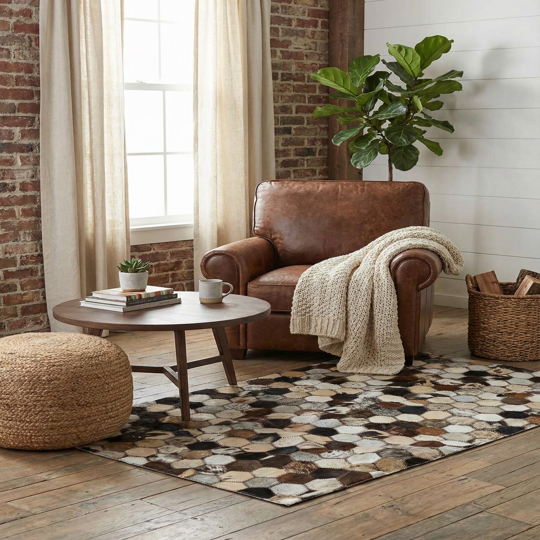 The palette and geometry suit a range of interiors: contemporary rustic, modern farmhouse, or eclectic living spaces that welcome mixed materials. Place it as a focused accent by an armchair, at the foot of a bed, under a small side table or console, or layered over a larger neutral floor covering to introduce pattern and depth. It pairs especially well with warm wood tones, leather upholstery and muted linens to reinforce an inviting, grounded look.