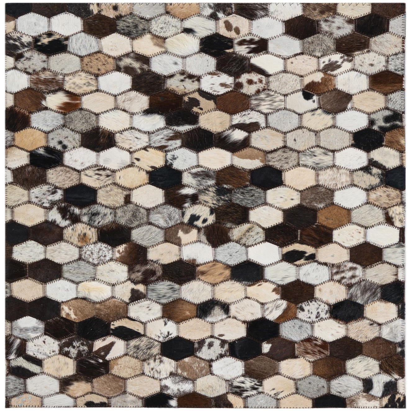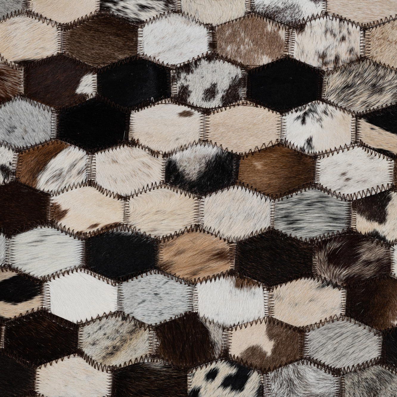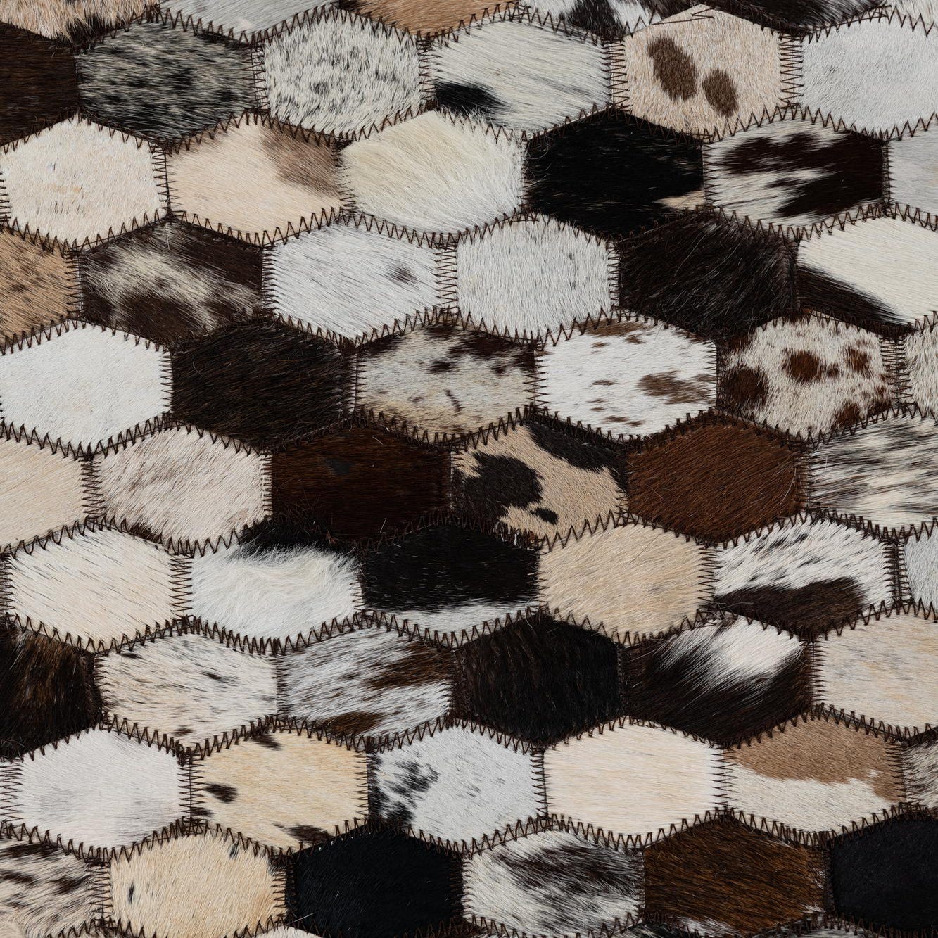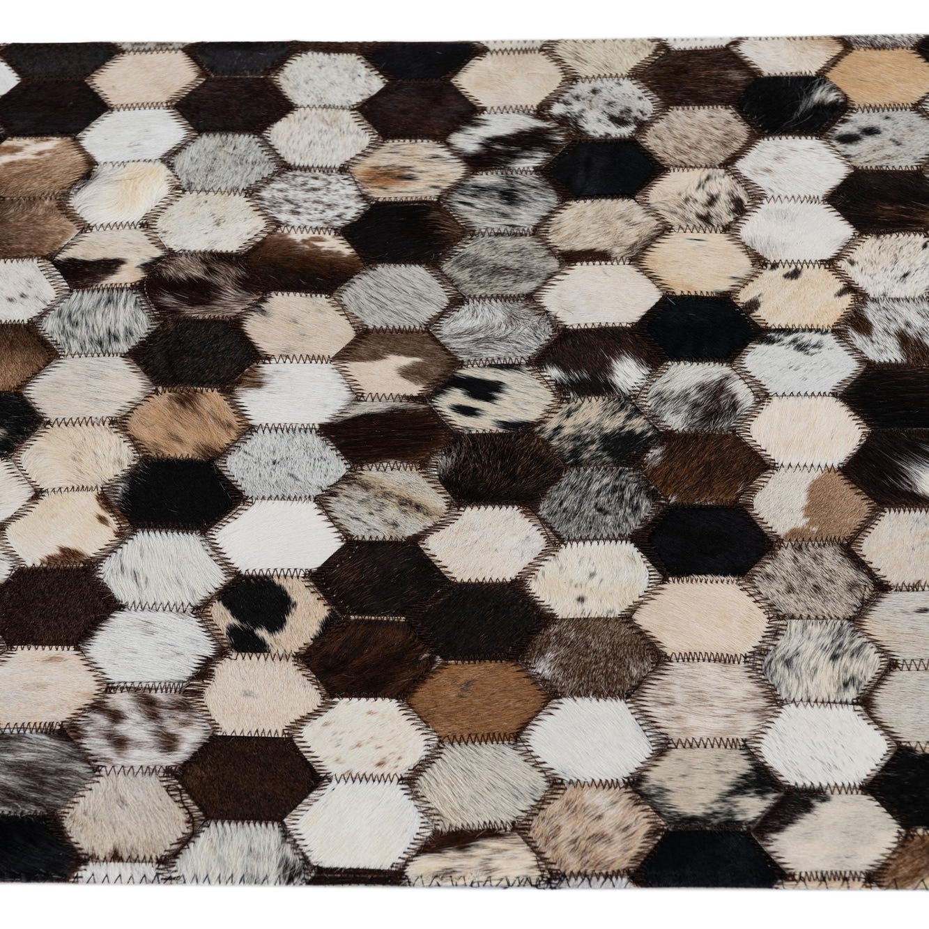 A honeycomb patchwork of stitched cowhide hexagons creates a graphic, tactile surface in a multi-colored field. Each patch carries its own natural markings and shades—beige, ivory, tan, light brown, brown and black—so the pattern balances warm neutrals with darker contrast. Hand made of cowhide and leather, the rug has a hair-on-hide finish with a short, soft nap and visible stitching that gives both texture and a handcrafted feel underfoot.